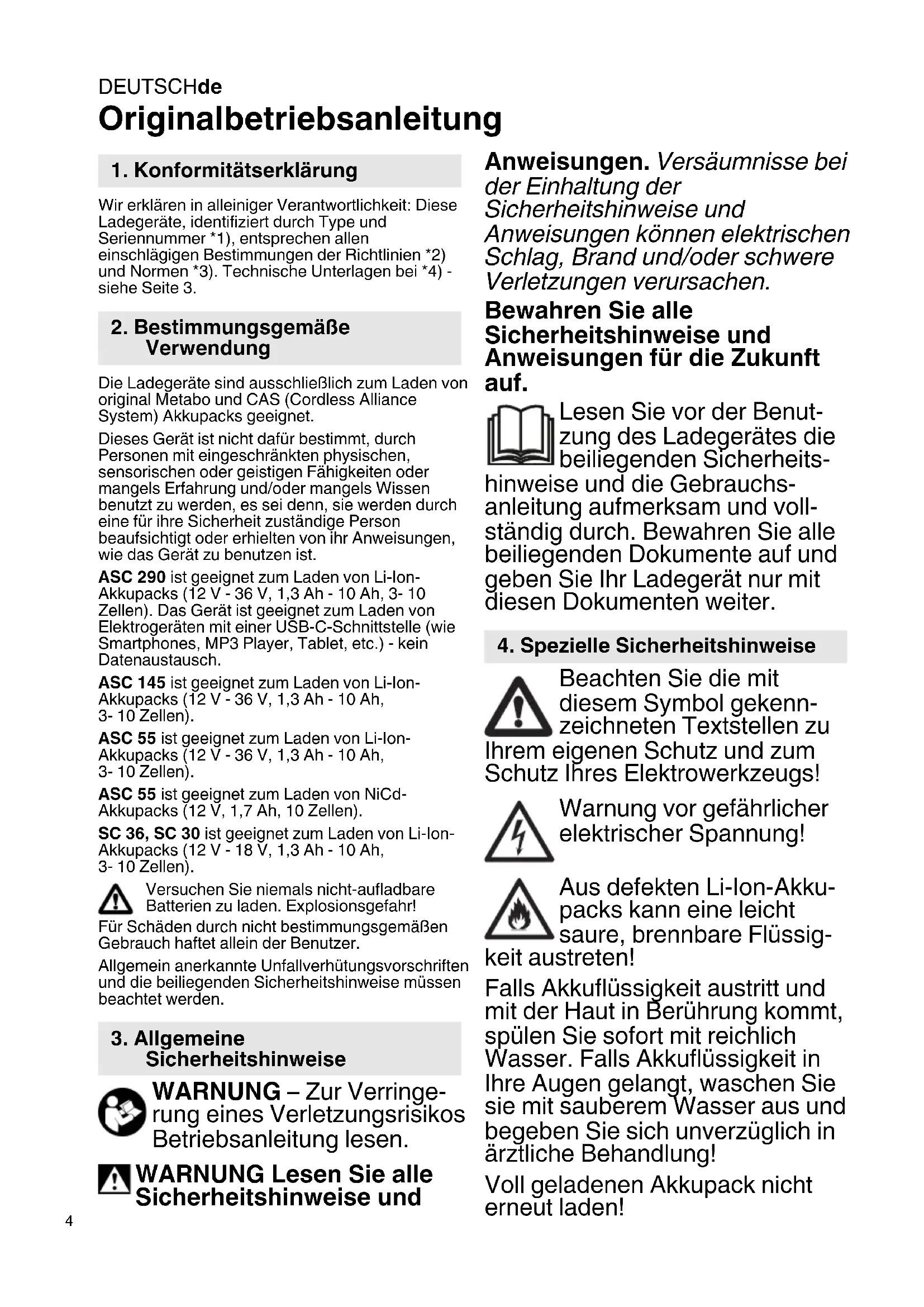 Originalbetriebsanleitung Wir erklären in alleiniger Verantwortlichkeit: Diese Ladegeräte, identifiziert durch Type und Seriennummer *1), entsprechen allen einschlägigen Bestimmungen der Richtlinien *2) und Normen *3). Technische Unterlagen bei *4) - siehe Seite 3. Die Ladegeräte sind ausschließlich zum Laden von original Metabo und CAS (Cordless Alliance System) Akkupacks geeignet. Dieses Gerät ist nicht dafür bestimmt, durch Personen mit eingeschränkten physischen, sensorischen oder geistigen Fähigkeiten oder mangels Erfahrung und/oder mangels Wissen benutzt zu werden, es sei denn, sie werden durch eine für ihre Sicherheit zuständige Person beaufsichtigt oder erhielten von ihr Anweisungen, wie das Gerät zu benutzen ist. ASC 290 ist geeignet zum Laden von Li-Ion- Akkupacks (12 V - 36 V, 1,3 Ah - 10 Ah, 3- 10 Zellen). Das Gerät ist geeignet zum Laden von Elektrogeräten mit einer USB-C-Schnittstelle (wie Smartphones, MP3 Player, Tablet, etc.) - kein Datenaustausch. ASC 145 ist geeignet zum Laden von Li-Ion- Akkupacks (12 V - 36 V, 1,3 Ah - 10 Ah,