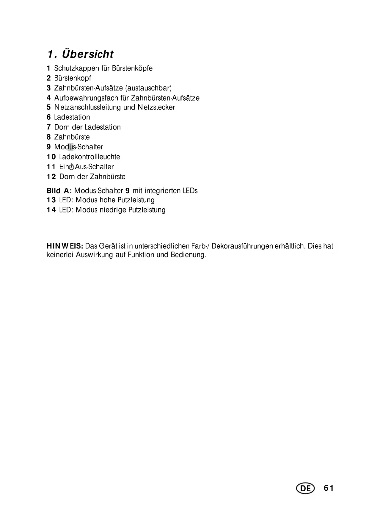 1 Schutzkappen für Bürstenköpfe 2 Bürstenkopf 3 Zahnbürsten-Aufsätze (austauschbar) 4 Aufbewahrungsfach für Zahnbürsten-Aufsätze 5 Netzanschlussleitung und Netzstecker 6 Ladestation 7 Dorn der Ladestation 8 Zahnbürste 9 Modus-Schalter 10 Ladekontrollleuchte 11 Ein-/Aus-Schalter 12 Dorn der Zahnbürste Bild A: Modus-Schalter|9 mit integrierten LEDs 13 LED: Modus hohe Putzleistung 14 LED: Modus niedrige Putzleistung HINWEIS: Das Gerät ist in unterschiedlichen Farb-/Dekorausführungen erhältlich. Dies hat keinerlei Auswirkung auf Funktion und Bedienung.62