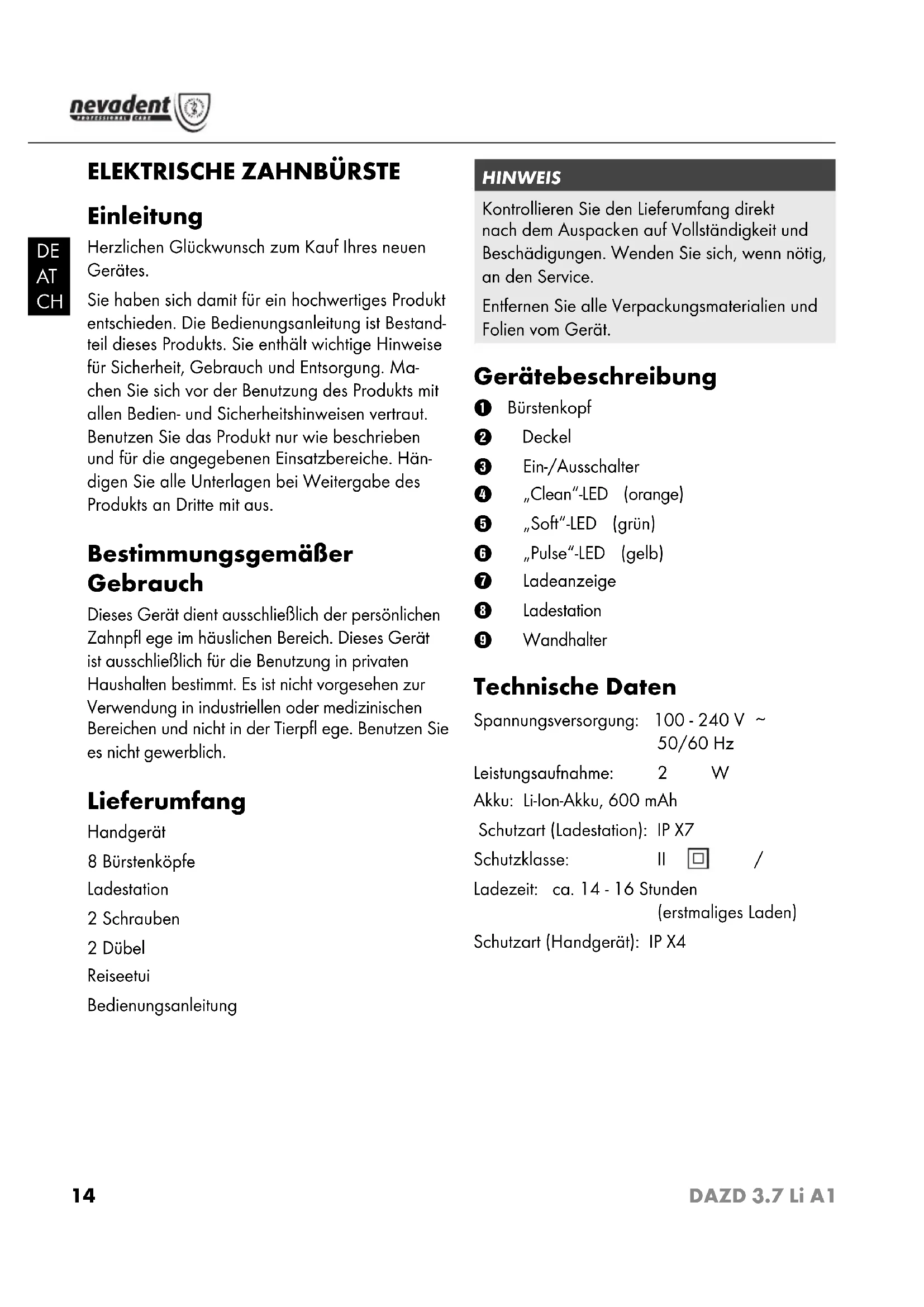 DAZD 3.7 Li A1 - Zahnbürste NEVADENT - Kostenlose Bedienungsanleitung