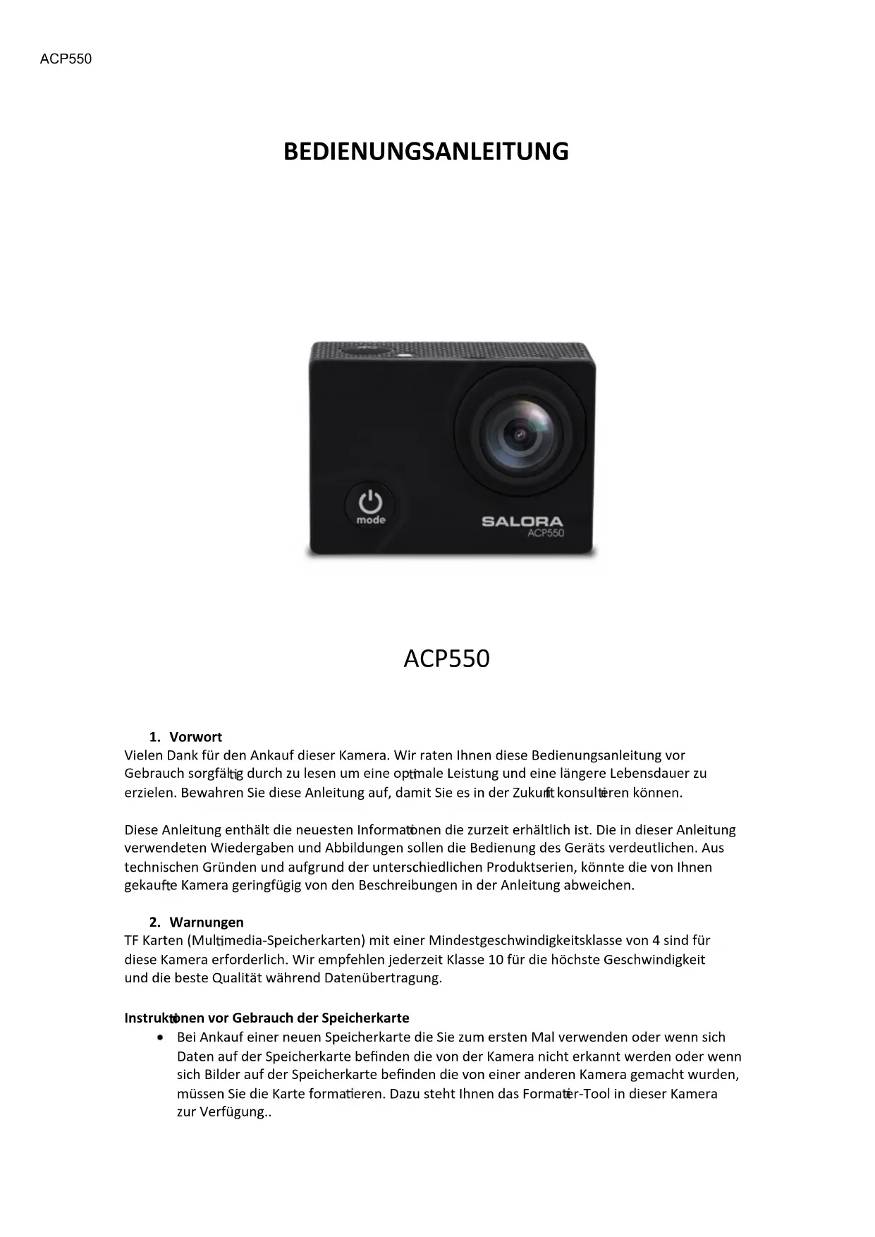 ACP550 - Sportkamera SALORA - Kostenlose Bedienungsanleitung