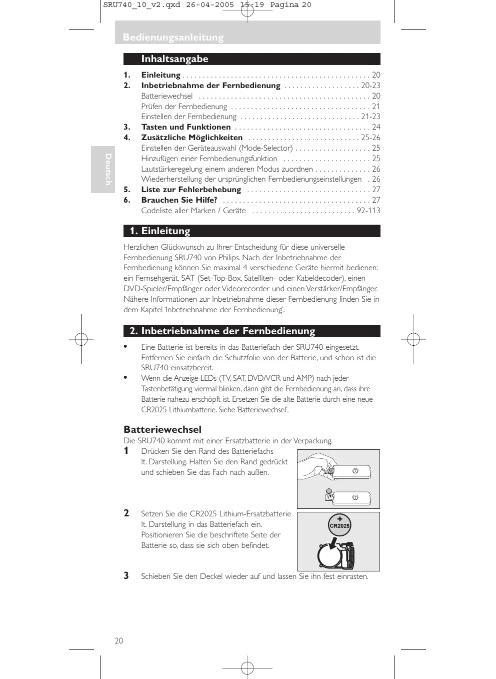SRU740_10_v2.qxd 26-04-2005 15:19 Pagina 20 Bedienungsanleitung Bedienungsanleitung Inhaltsangabe