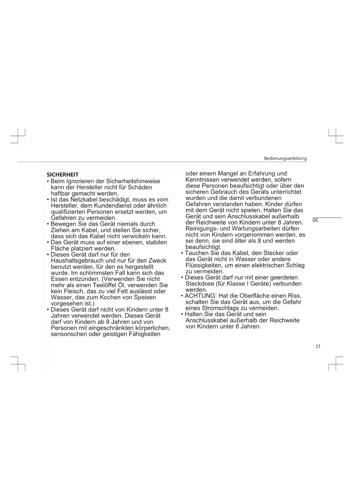 - Halten Sie das Gerät und sein Anschlusskabel außerhalb der Reichweite von Kindern unter 8 Jahren. DEBedienungsanleitung