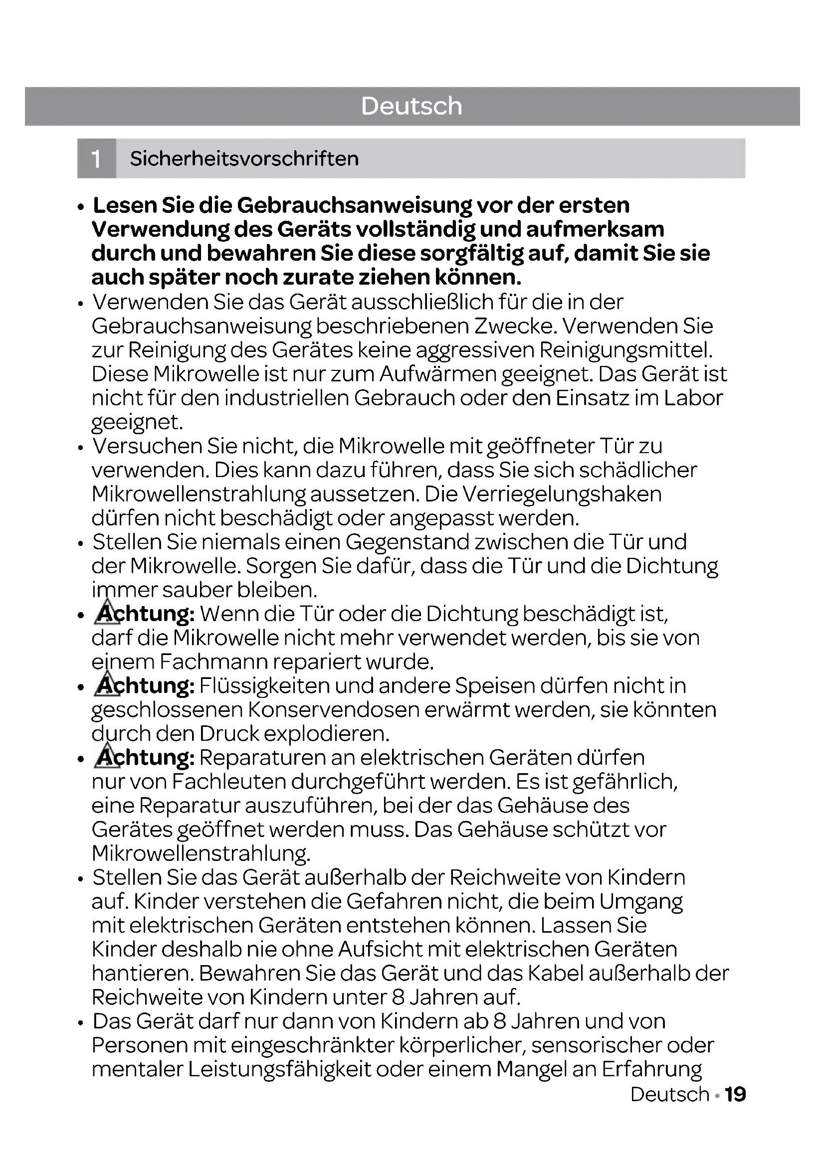 - Verwenden Sie das Gerät ausschließlich für die in der Gebrauchsanweisung beschrieben Zwecke. Verwenden Sie zur Reinigung des Gerätes keine aggressiven Reinigungsmittel. Diese Mikrowelle ist nur zum Aufwärmen geeignet. Das Gerät ist nicht für den industriellen Gebrauch oder den Einsatz im Labor geeignet.