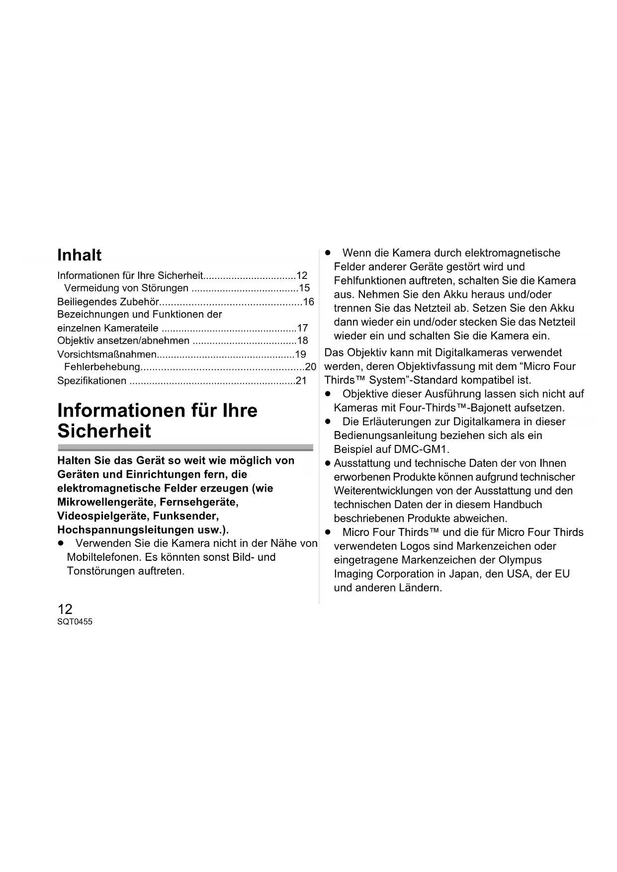 - Spezifikationen Informationen für Ihre Sicherheit Halten Sie das Gerät so weit wie möglich von Geräten und Einrichtungen fern, die elektromagnetische Felder erzeugen (wie Mikrowellengeräte, Fernsehgeräte, Videospielgeräte, Funksender, Hochspannungsleitungen usw.). ≥ Verwenden Sie die Kamera nicht in der Nähe von Mobiltelefonen. Es könnten sonst Bild- und Tonstörungen auftreten. ≥ Wenn die Kamera durch elektromagnetische Felder anderer Geräte gestört wird und Fehlfunktionen auftreten, schalten Sie die Kamera aus. Nehmen Sie den Akku heraus und/oder trennen Sie das Netzteil ab. Setzen Sie den Akku dann wieder ein und/oder stecken Sie das Netzteil wieder ein und schalten Sie die Kamera ein. Das Objektiv kann mit Digitalkameras verwendet werden, deren Objektivfassung mit dem “Micro Four Thirds™ System”-Standard kompatibel ist. ≥ Objektive dieser Ausführung lassen sich nicht auf Kameras mit Four-Thirds™-Bajonett aufsetzen. ≥ Die Erläuterungen zur Digitalkamera in dieser Bedienungsanleitung beziehen sich als ein Beispiel auf DMC-GM1. p. 21