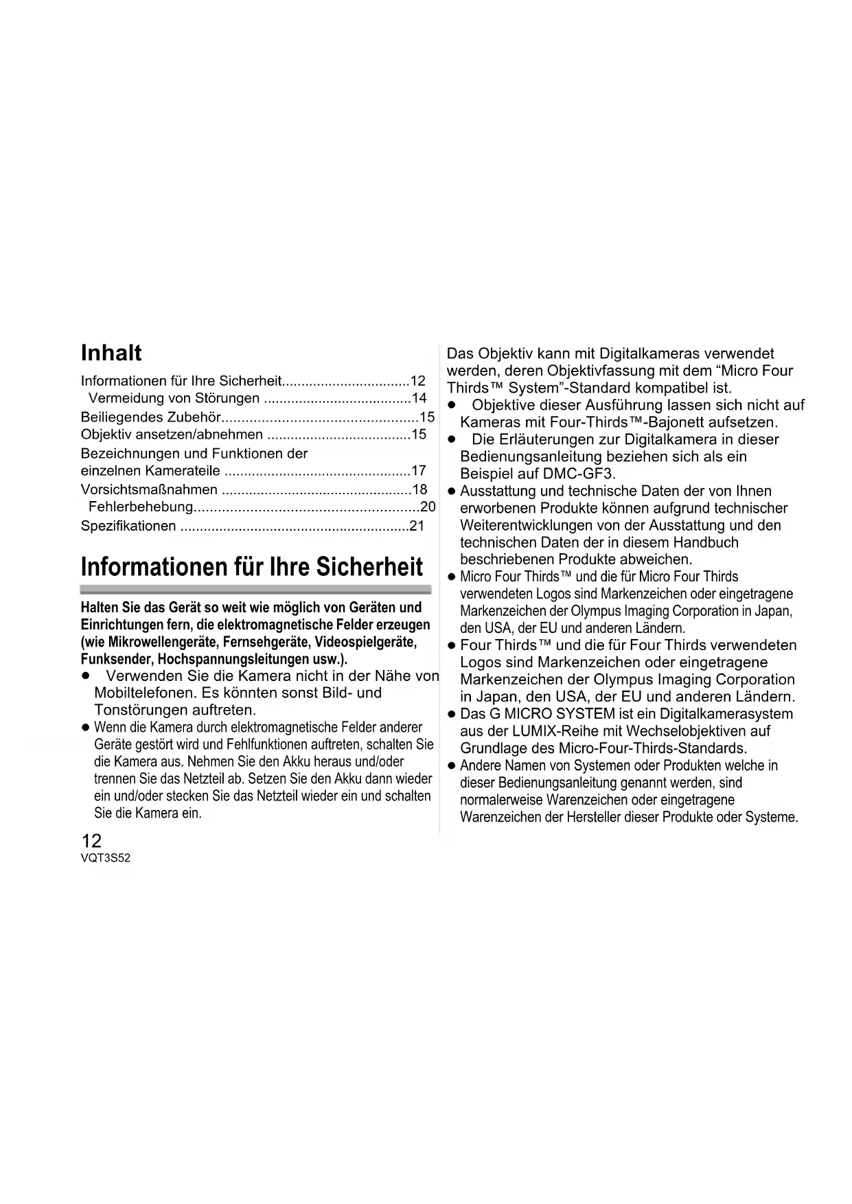 - reference line) Maximum image magnification 0.17k (35 mm film camera equivalent: 0.34k) Optical image stabilizer Available [O.I.S.] switch None (Setting of the [STABILIZER] is done in [REC] mode menu by LUMIX digital cameras.) Mount “Micro Four Thirds Mount” Angle of view 75 x (Wide) to 29x (Tele) Filter diameter 37 mm Max. diameter Approx. 61 mm Overall length Approx. 26.8 mm (from the tip of the lens to the base side of the lens mount when the lens barrel is recessed) Mass Approx. 95 g VQT3S52_E.book 11 ページ 2011年8月30日 火曜日 午後5時55分12 VQT3S52 Inhalt Informationen für Ihre Sicherheit p. 12