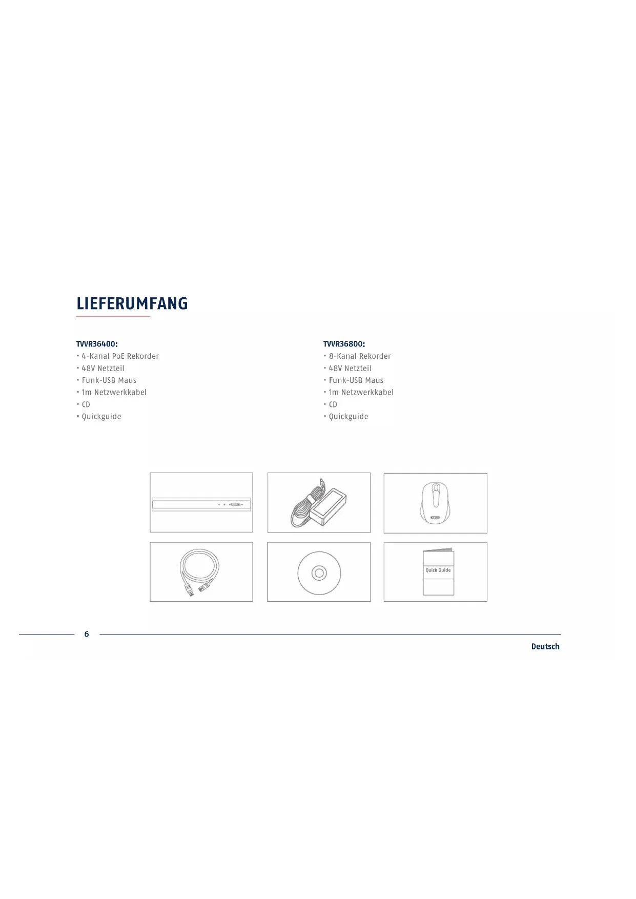 - Quickguide7 Deutsch WARNHINWEISE Betreiben und lagern Sie den Rekorder nur unter den vom Hersteller empfohlenen Umgebungsbedingungen. Achten Sie darauf, dass immer eine ausreichende Belüung vorhanden ist. Achten Sie auf eine unterbrechungs- freie Stromversorgung. Halten Sie starke Magnetfelder vom Rekorder fern. Halten Sie Flüssigkeiten vom Rekorder fern. Schalten Sie den Rekorder aus, bevor Sie Peripheriegeräte anschließen oder entfernen.8 Deutsch ANSCHLÜSSE Daten LED Anzeige der momentanen HDD Aktivität USB Anschluss für USB-Geräte Power LED Anzeige der Betriebsbereitscha Netzwerk LED Anzeige der momentanen Netzwerk Aktivität9 Deutsch Ein-/Aus Schalter Schalter zum Ein- und Ausschalten Audio IN Audioeingang Chinch Audio OUT Audioausgang Chinch VGA VGA Monitoranschluss HDMI HDMI Monitoranschluss USB Anschluss für USB-Geräte LAN RJ45-Anschluss für eine Netzwerkverbindung 48V 48V DC Stromanschluss PoE RJ45-Anschlüsse für Kameraverbindungen10 Deutsch