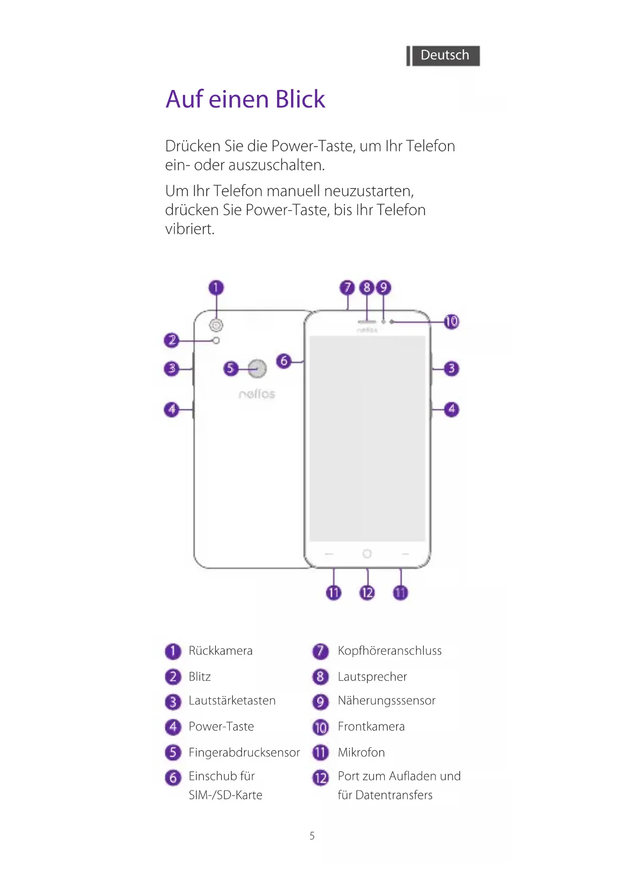 English Unlock phone Lock apps Take pictures5 6 Auf einen Blick Deutsch Drücken Sie die Power-Taste, um Ihr Telefon ein- oder auszuschalten. Um Ihr Telefon manuell neuzustarten, drücken Sie Power-Taste, bis Ihr Telefon vibriert. LautstärketastenPower-TasteFingerabdrucksensorEinschub für SIM-/SD-KarteBlitzRückkamera