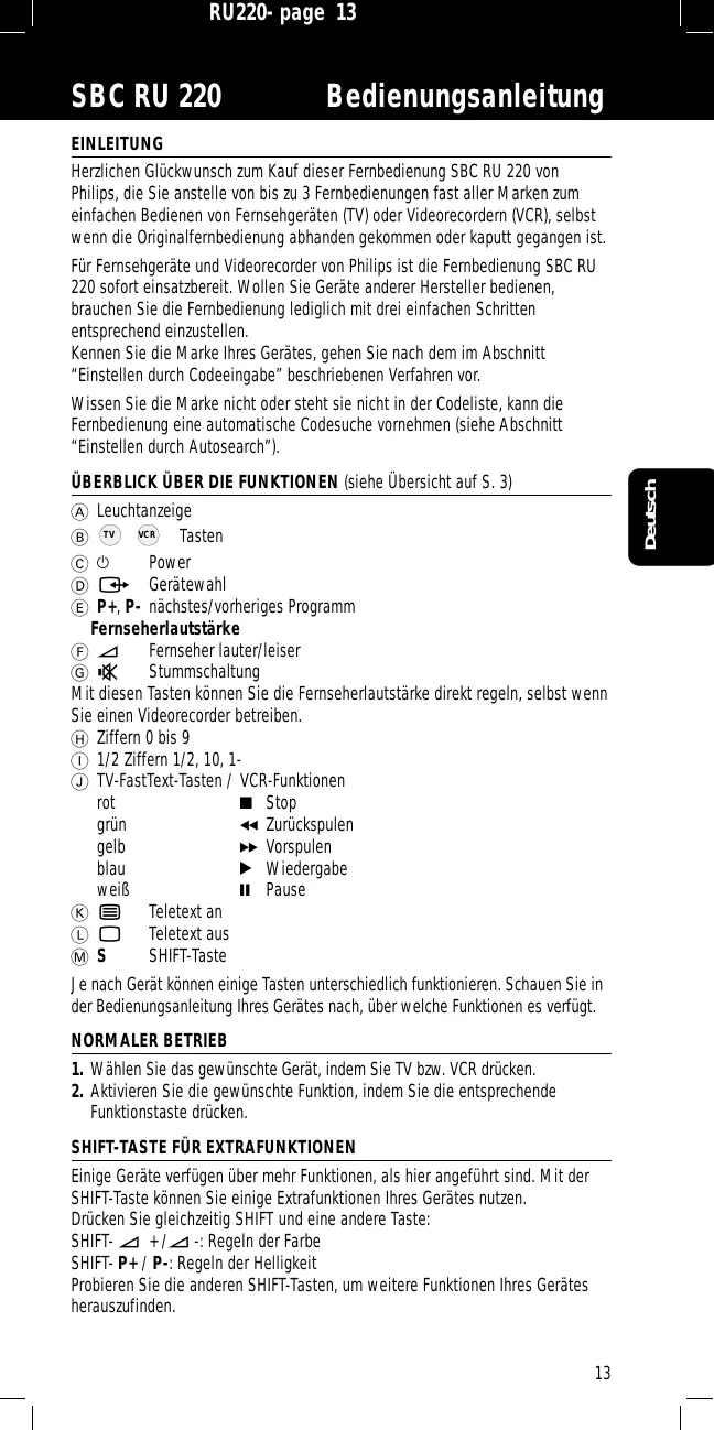 EINLEITUNG Herzlichen Glückwunsch zum Kauf dieser Fernbedienung SBC RU 220 von Philips, die Sie anstelle von bis zu 3 Fernbedienungen fast aller Marken zum einfachen Bedienen von Fernsehgeräten (TV) oder Videorecordern (VCR), selbst wenn die Originalfernbedienung abhanden gekommen oder kaputt gegangen ist. Für Fernsehgeräte und Videorecorder von Philips ist die Fernbedienung SBC RU 220 sofort einsatzbereit. Wollen Sie Geräte anderer Hersteller bedienen, brauchen Sie die Fernbedienung lediglich mit drei einfachen Schritten entsprechend einzustellen. Kennen Sie die Marke Ihres Gerätes, gehen Sie nach dem im Abschnitt “Einstellen durch Codeeingabe” beschriebenen Verfahren vor.