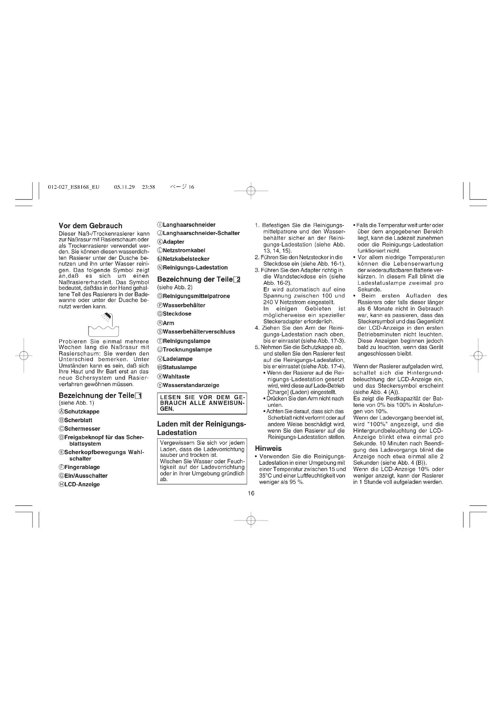 012-027ES8168EU 05.11.29 23:58 ページ1517 Vor dem Gebrauch Dieser Naß-/Trockenrasierer kann zur Naßrasur mit Rasierschaum oder als Trockenrasierer verwendet wer- den. Sie können diesen wasserdich- ten Rasierer unter der Dusche be- nutzen und ihn unter Wasser reini- gen. Das folgende Symbol zeigt an,daß es sich um einen Naßrasiererhandelt. Das Symbol bedeutet, daßdas in der Hand gehal- tene Teil des Rasierers in der Bade- wanne oder unter der Dusche be- nutzt werden kann. Probieren Sie einmal mehrere Wochen lang die Naßrasur mit Rasierschaum: Sie werden den Unterschied bemerken. Unter Umständen kann es sein, daß sich Ihre Haut und Ihr Bart erst an das neue Schersystem und Rasier- verfahren gewöhnen müssen. Bezeichnung der Teile 1 (siehe Abb. 1) A Schutzkappe B Scherblatt C Schermesser D Freigabeknopf für das Scher- blattsystem E Scherkopfbewegungs Wahl- schalter F Fingerablage G Ein/Ausschalter H LCD-Anzeige I Langhaarschneider J Langhaarschneider-Schalter K Adapter L Netzstromkabel M Netzkabelstecker N Reinigungs-Ladestation Bezeichnung der Teile 2 (siehe Abb. 2) O Reinigungsmittelpatrone P Wasserbehälter Q Steckdose R Arm S Wasserbehälterverschluss T Reinigungslampe U Trocknungslampe V Ladelampe W Statuslampe X Wahltaste Y Wasserstandanzeige