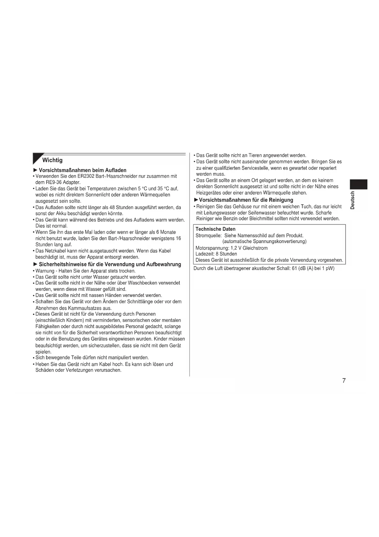 - Wenn der Bart-/Haarschneider nicht Funktioniert, setzen Sieihn noch etwa 1 Minute länger aufladen.