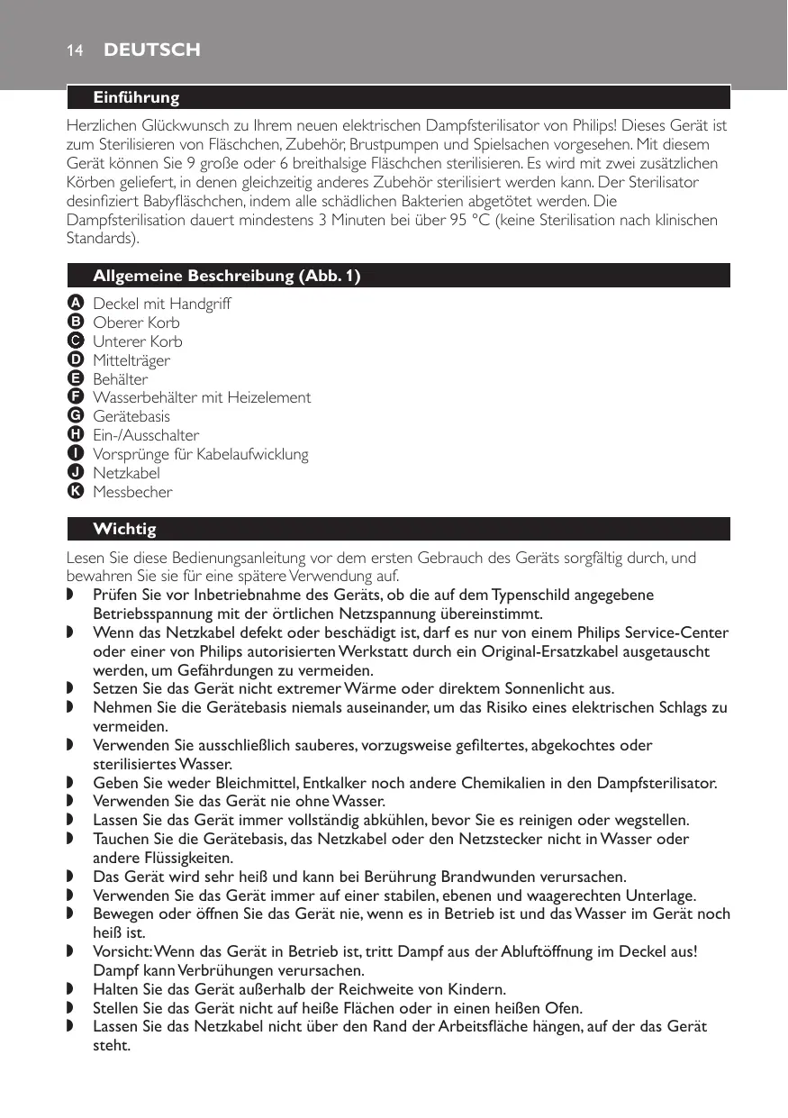 Deckel mit Handgriff Oberer Korb Unterer Korb Mittelträger Behälter Wasserbehälter mit Heizelement Gerätebasis Ein-/Ausschalter Vorsprünge für Kabelaufwicklung Netzkabel Messbecher Wichtig Lesen Sie diese Bedienungsanleitung vor dem ersten Gebrauch des Geräts sorgfältig durch, und bewahren Sie sie für eine spätere Verwendung auf. , Prüfen Sie vor Inbetriebnahme des Geräts, ob die auf dem Typenschild angegebene Betriebsspannung mit der örtlichen Netzspannung übereinstimmt. , Wenn das Netzkabel defekt oder beschädigt ist, darf es nur von einem Philips Service-Center oder einer von Philips autorisierten Werkstatt durch ein Original-Ersatzkabel ausgetauscht werden, um Gefährdungen zu vermeiden. , Setzen Sie das Gerät nicht extremer Wärme oder direktem Sonnenlicht aus. , Nehmen Sie die Gerätebasis niemals auseinander, um das Risiko eines elektrischen Schlags zu vermeiden. , Verwenden Sie ausschließlich sauberes, vorzugsweise gefiltertes, abgekochtes oder sterilisiertes Wasser. , Geben Sie weder Bleichmittel, Entkalker noch andere Chemikalien in den Dampfsterilisator. , Verwenden Sie das Gerät nie ohne Wasser. , Lassen Sie das Gerät immer vollständig abkühlen, bevor Sie es reinigen oder wegstellen. , Tauchen Sie die Gerätebasis, das Netzkabel oder den Netzstecker nicht in Wasser oder andere Flüssigkeiten. , Das Gerät wird sehr heiß und kann bei Berührung Brandwunden verursachen. , Verwenden Sie das Gerät immer auf einer stabilen, ebenen und waagerechten Unterlage. , Bewegen oder öffnen Sie das Gerät nie, wenn es in Betrieb ist und das Wasser im Gerät noch heiß ist. , Vorsicht: Wenn das Gerät in Betrieb ist, tritt Dampf aus der Abluftöffnung im Deckel aus! Dampf kann Verbrühungen verursachen. , Halten Sie das Gerät außerhalb der Reichweite von Kindern. , Stellen Sie das Gerät nicht auf heiße Flächen oder in einen heißen Ofen. , Lassen Sie das Netzkabel nicht über den Rand der Arbeitsfläche hängen, auf der das Gerät steht. Deutsch 15