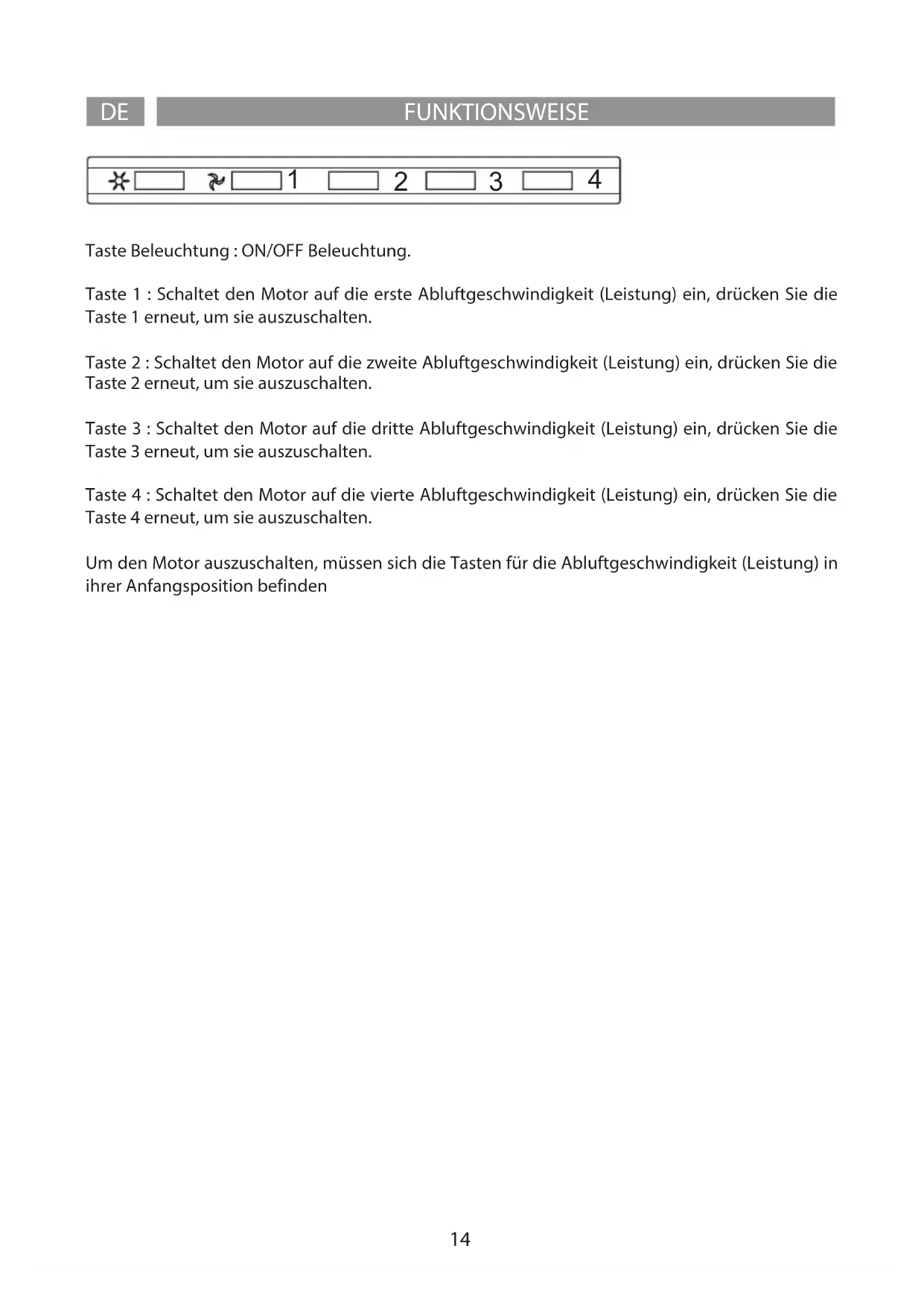 Taste Beleuchtung : ON/OFF Beleuchtung. Taste 1 : Schaltet den Motor auf die erste Abluftgeschwindigkeit (Leistung) ein, drücken Sie die Taste 1 erneut, um sie auszuschalten. Taste 2 : Schaltet den Motor auf die zweite Abluftgeschwindigkeit (Leistung) ein, drücken Sie die Taste 2 erneut, um sie auszuschalten. Taste 3 : Schaltet den Motor auf die dritte Abluftgeschwindigkeit (Leistung) ein, drücken Sie die Taste 3 erneut, um sie auszuschalten. Taste 4 : Schaltet den Motor auf die vierte Abluftgeschwindigkeit (Leistung) ein, drücken Sie die Taste 4 erneut, um sie auszuschalten. Um den Motor auszuschalten, müssen sich die Tasten für die Abluftgeschwindigkeit (Leistung) in ihrer Anfangsposition befinden