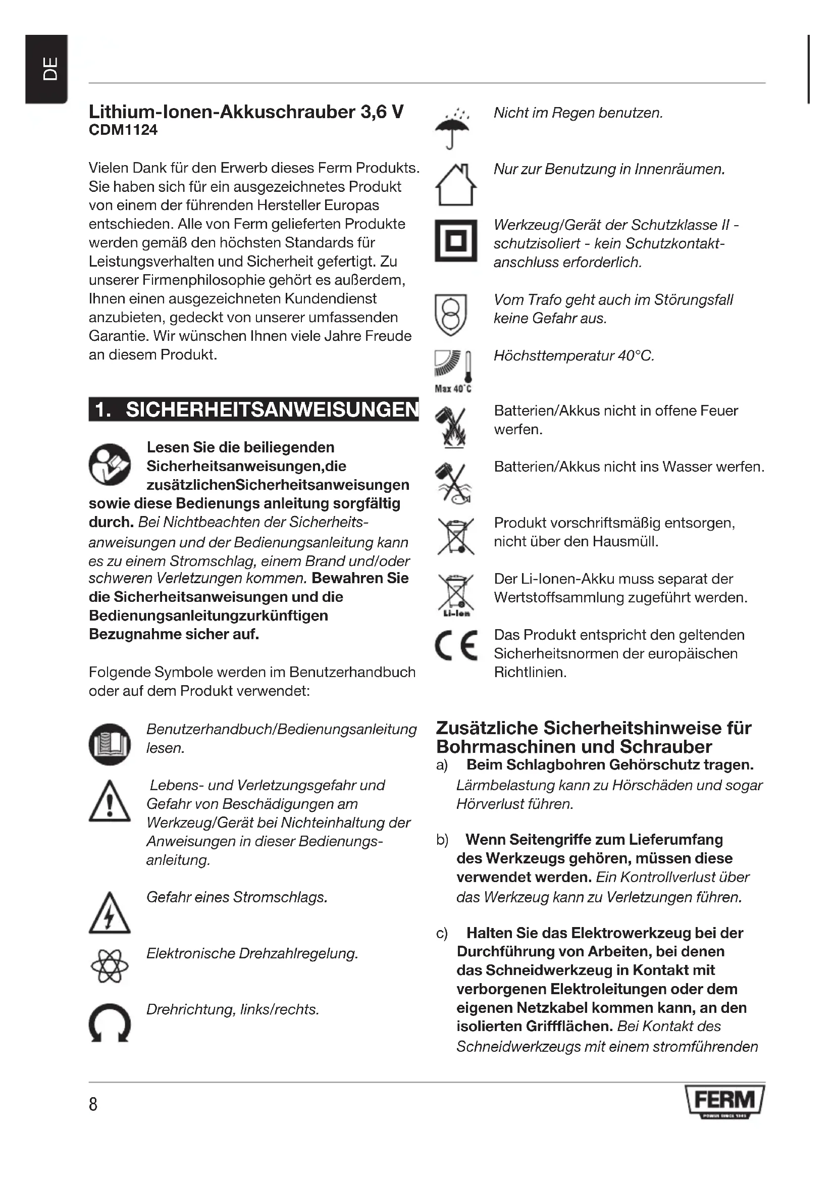Lithium-Ionen-Akkuschrauber 3,6 V CDM1124 Vielen Dank für den Erwerb dieses Ferm Produkts. Sie haben sich für ein ausgezeichnetes Produkt von einem der führenden Hersteller Europas entschieden. Alle von Ferm gelieferten Produkte werden gemäß den höchsten Standards für Leistungsverhalten und Sicherheit gefertigt. Zu unserer Firmenphilosophie gehört es außerdem, Ihnen einen ausgezeichneten Kundendienst anzubieten, gedeckt von unserer umfassenden Garantie. Wir wünschen Ihnen viele Jahre Freude an diesem Produkt.