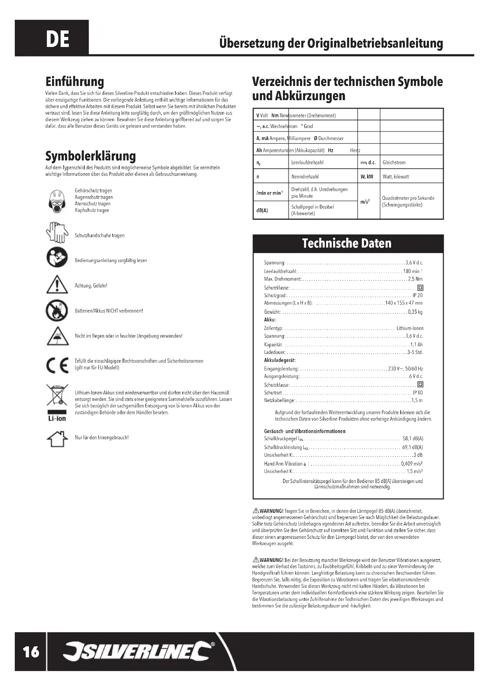 Silverline Tools garantiert keine Reparature, die durch Folgenden erforderlich geworden sind: Normale Verschleibercheinungen, die bzw. Verwendung entsprechend der Bedienungsanleitung entstehen, z.B. an Messern, Bürsten, Riemen, Gluhbrinnen, Batterien usw