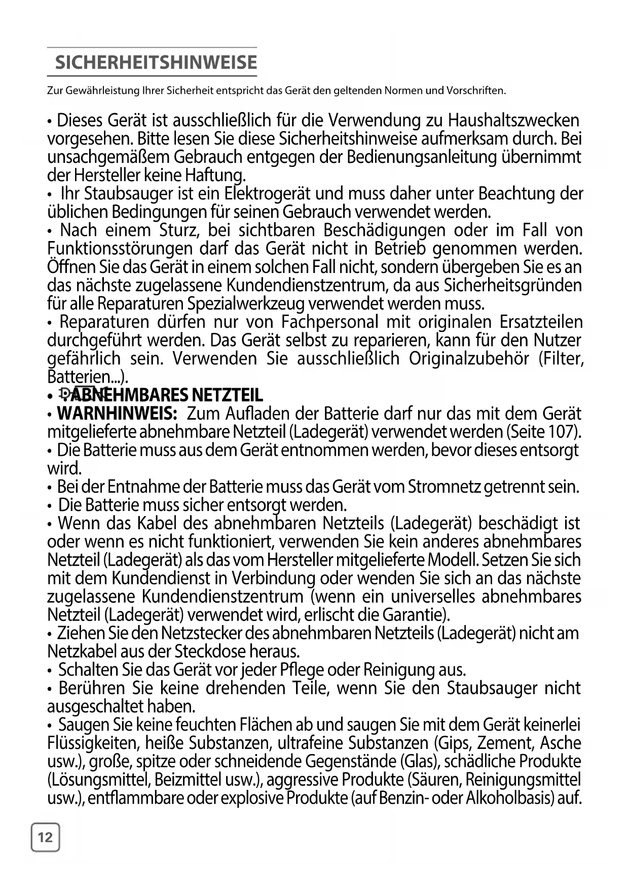 - Vor der Reinigung oder Wartung des Gerätes muss der Stecker aus der Steckdose gezogen werden. DE14 SICHERHEITSHINWEISE FÜR DIE BATTERIEN* (*je nach Modell)