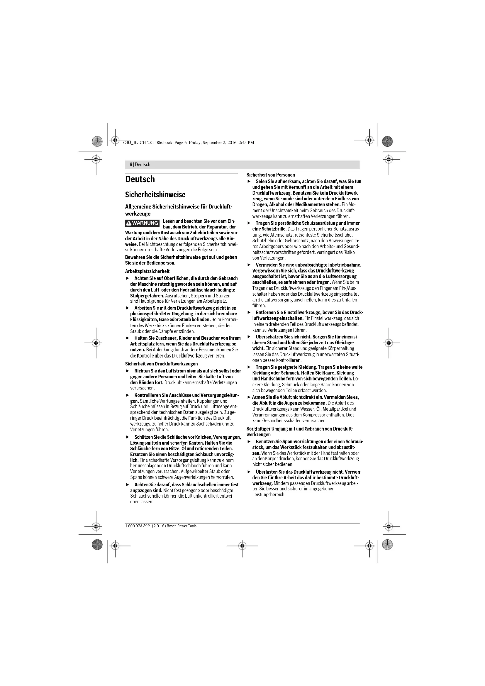OBJ_BUCH-281-006.book Page 5 Friday, September 2, 2016 2:45 PM6 | Deutsch 1 609 92A 39P | (2.9.16) Bosch Power Tools Deutsch Sicherheitshinweise Allgemeine Sicherheitshinweise für Druckluft- werkzeuge Lesen und beachten Sie vor dem Ein- bau, dem Betrieb, der Reparatur, der Wartung und dem Austausch von Zubehörteilen sowie vor der Arbeit in der Nähe des Druckluftwerkzeugs alle Hin- weise. Bei Nichtbeachtung der folgenden Sicherheitshinwei- se können ernsthafte Verletzungen die Folge sein. Bewahren Sie die Sicherheitshinweise gut auf und geben Sie sie der Bedienperson. Arbeitsplatzsicherheit Achten Sie auf Oberflächen, die durch den Gebrauch der Maschine rutschig geworden sein können, und auf durch den Luft- oder den Hydraulikschlauch bedingte Stolpergefahren. Ausrutschen, Stolpern und Stürzen sind Hauptgründe für Verletzungen am Arbeitsplatz. Arbeiten Sie mit dem Druckluftwerkzeug nicht in ex- plosionsgefährdeter Umgebung, in der sich brennbare Flüssigkeiten, Gase oder Staub befinden. Beim Bearbei- ten des Werkstücks können Funken entstehen, die den Staub oder die Dämpfe entzünden. Halten Sie Zuschauer, Kinder und Besucher von Ihrem Arbeitsplatz fern, wenn Sie das Druckluftwerkzeug be- nutzen. Bei Ablenkung durch andere Personen können Sie die Kontrolle über das Druckluftwerkzeug verlieren. Sicherheit von Druckluftwerkzeugen Richten Sie den Luftstrom niemals auf sich selbst oder gegen andere Personen und leiten Sie kalte Luft von den Händen fort. Druckluft kann ernsthafte Verletzungen verursachen. Kontrollieren Sie Anschlüsse und Versorgungsleitun- gen. Sämtliche Wartungseinheiten, Kupplungen und Schläuche müssen in Bezug auf Druck und Luftmenge ent- sprechend den technischen Daten ausgelegt sein. Zu ge- ringer Druck beeinträchtigt die Funktion des Druckluft- werkzeugs, zu hoher Druck kann zu Sachschäden und zu Verletzungen führen. Schützen Sie die Schläuche vor Knicken, Verengungen, Lösungsmitteln und scharfen Kanten. Halten Sie die Schläuche fern von Hitze, Öl und rotierenden Teilen. Ersetzen Sie einen beschädigten Schlauch unverzüg- lich. Eine schadhafte Versorgungsleitung kann zu einem herumschlagenden Druckluftschlauch führen und kann Verletzungen verursachen. Aufgewirbelter Staub oder Späne können schwere Augenverletzungen hervorrufen. Achten Sie darauf, dass Schlauchschellen immer fest angezogen sind. Nicht fest gezogene oder beschädigte Schlauchschellen können die Luft unkontrolliert entwei- chen lassen. Sicherheit von Personen Seien Sie aufmerksam, achten Sie darauf, was Sie tun und gehen Sie mit Vernunft an die Arbeit mit einem Druckluftwerkzeug. Benutzen Sie kein Druckluftwerk- zeug, wenn Sie müde sind oder unter dem Einfluss von Drogen, Alkohol oder Medikamenten stehen. Ein Mo- ment der Unachtsamkeit beim Gebrauch des Druckluft- werkzeugs kann zu ernsthaften Verletzungen führen. Tragen Sie persönliche Schutzausrüstung und immer eine Schutzbrille. Das Tragen persönlicher Schutzausrüs- tung, wie Atemschutz, rutschfeste Sicherheitsschuhe, Schutzhelm oder Gehörschutz, nach den Anweisungen Ih- res Arbeitgebers oder wie nach den Arbeits- und Gesund- heitsschutzvorschriften gefordert, verringert das Risiko von Verletzungen. Vermeiden Sie eine unbeabsichtigte Inbetriebnahme. Vergewissern Sie sich, dass das Druckluftwerkzeug ausgeschaltet ist, bevor Sie es an die Luftversorgung anschließen, es aufnehmen oder tragen. Wenn Sie beim Tragen des Druckluftwerkzeugs den Finger am Ein-/Aus- schalter haben oder das Druckluftwerkzeug eingeschaltet an die Luftversorgung anschließen, kann dies zu Unfällen führen. Entfernen Sie Einstellwerkzeuge, bevor Sie das Druck- luftwerkzeug einschalten. Ein Einstellwerkzeug, das sich in einem drehenden Teil des Druckluftwerkzeugs befindet, kann zu Verletzungen führen. Überschätzen Sie sich nicht. Sorgen Sie für einen si- cheren Stand und halten Sie jederzeit das Gleichge- wicht. Ein sicherer Stand und geeignete Körperhaltung lassen Sie das Druckluftwerkzeug in unerwarteten Situati- onen besser kontrollieren. Tragen Sie geeignete Kleidung. Tragen Sie keine weite Kleidung oder Schmuck. Halten Sie Haare, Kleidung und Handschuhe fern von sich bewegenden Teilen. Lo- ckere Kleidung, Schmuck oder lange Haare können von sich bewegenden Teilen erfasst werden. Atmen Sie die Abluft nicht direkt ein. Vermeiden Sie es, die Abluft in die Augen zu bekommen. Die Abluft des Druckluftwerkzeugs kann Wasser, Öl, Metallpartikel und Verunreinigungen aus dem Kompressor enthalten. Dies kann Gesundheitsschäden verursachen. Sorgfältiger Umgang mit und Gebrauch von Druckluft- werkzeugen Benutzen Sie Spannvorrichtungen oder einen Schraub- stock, um das Werkstück festzuhalten und abzustüt- zen. Wenn Sie das Werkstück mit der Hand festhalten oder an den Körper drücken, können Sie das Druckluftwerkzeug nicht sicher bedienen. Überlasten Sie das Druckluftwerkzeug nicht. Verwen- den Sie für Ihre Arbeit das dafür bestimmte Druckluft- werkzeug. Mit dem passenden Druckluftwerkzeug arbei- ten Sie besser und sicherer im angegebenen Leistungsbereich. WARNUNG OBJ_BUCH-281-006.book Page 6 Friday, September 2, 2016 2:45 PMDeutsch | 7 Bosch Power Tools 1 609 92A 39P | (2.9.16) Benutzen Sie kein Druckluftwerkzeug, dessen Ein-/ Ausschalter defekt ist. Ein Druckluftwerkzeug, das sich nicht mehr ein- oder ausschalten lässt, ist gefährlich und muss repariert werden. Unterbrechen Sie die Luftversorgung, bevor Sie Gerä- teeinstellungen vornehmen, Zubehörteile wechseln oder bei längerem Nichtgebrauch. Diese Vorsichts- maßnahme verhindert den unbeabsichtigten Start des Druckluftwerkzeugs. Bewahren Sie unbenutzte Druckluftwerkzeuge außer- halb der Reichweite von Kindern auf. Lassen Sie Perso- nen das Druckluftwerkzeug nicht benutzen, die mit die- sem nicht vertraut sind oder diese Anweisungen nicht gelesen haben. Druckluftwerkzeuge sind gefährlich, wenn sie von unerfahrenen Personen benutzt werden. Pflegen Sie das Druckluftwerkzeug mit Sor