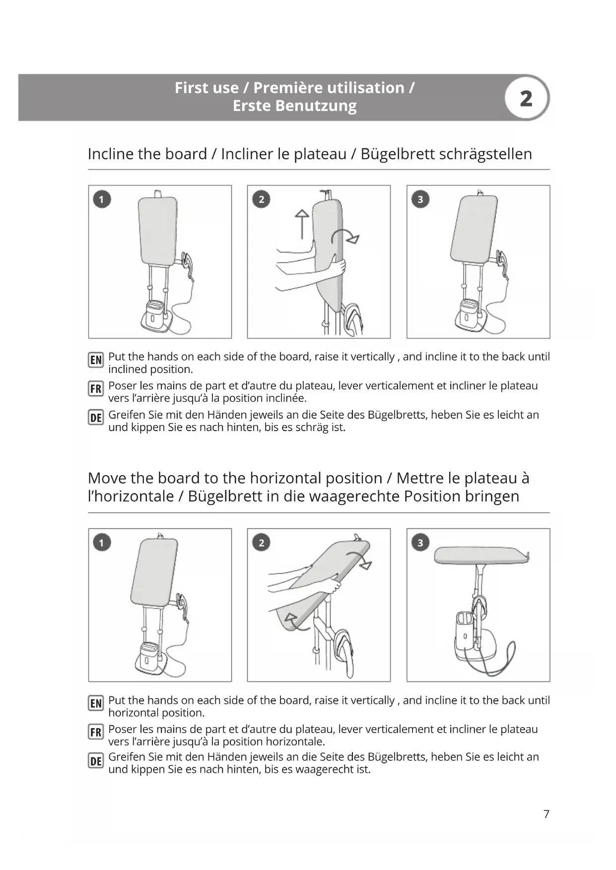 First use / Première utilisation / Erste Benutzung Incline the board / Incliner le plateau / Bügelbrett schrägstellen Move the board to the horizontal position / Mettre le plateau à l’horizontale / Bügelbrett in die waagerechte Position bringen