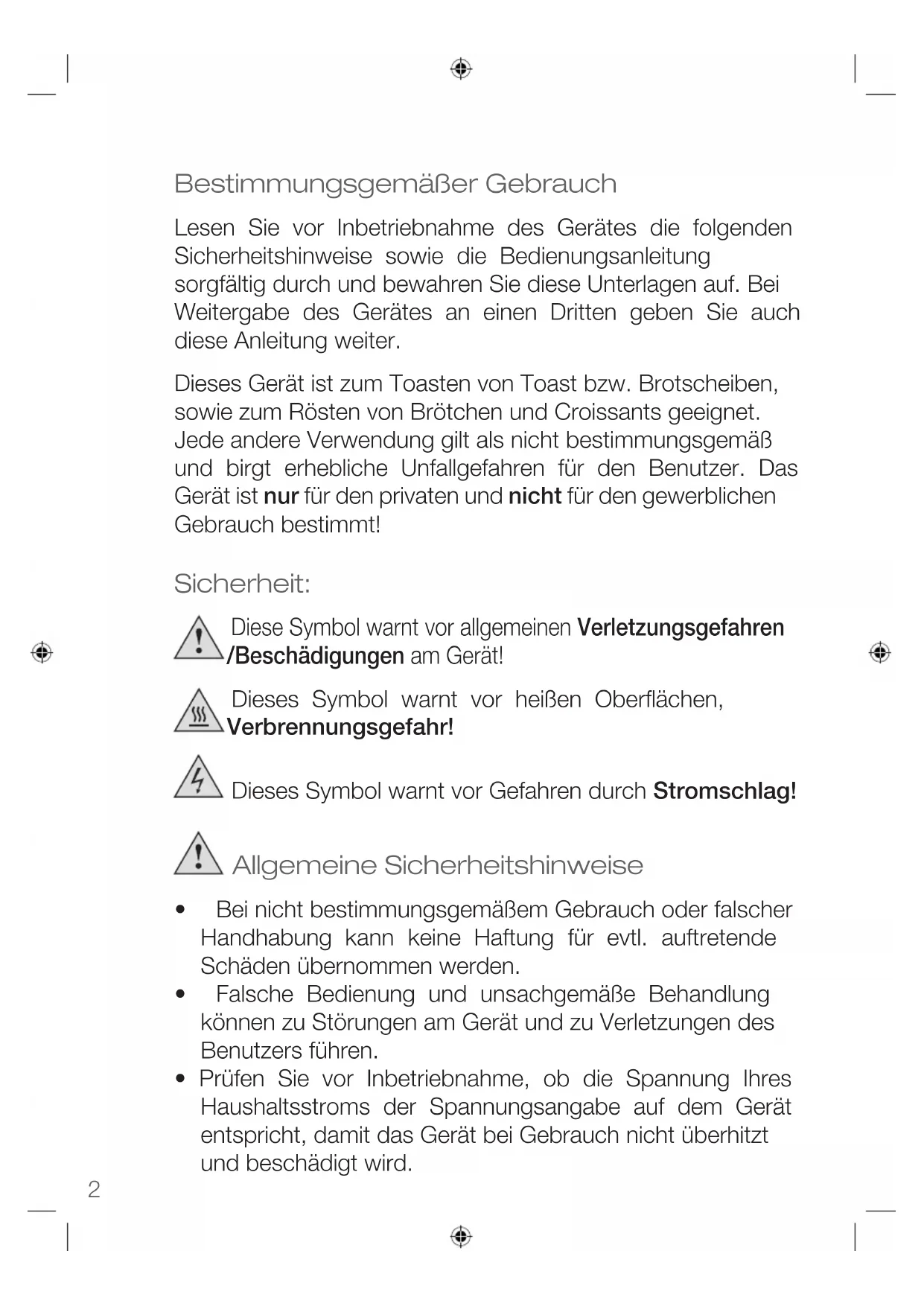 - In eingeschaltetem Zustand niemals mit der Hand in die Röstschlitze fassen. Es besteht Verletzungs- bzw. Verbrennungsgefahr!