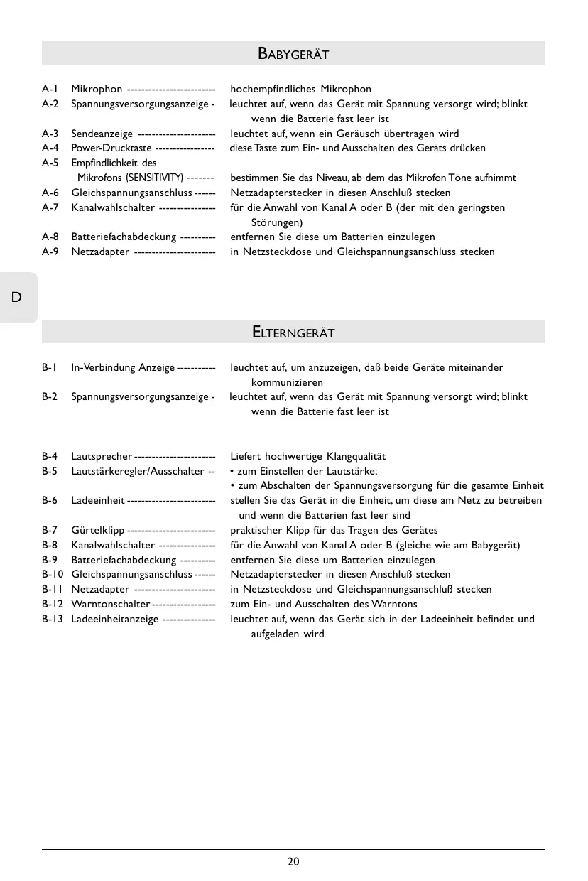 ELTERNGERÄT B-1 In-Verbindung Anzeige ----------- B-2 Spannungsversorgungsanzeige - B-4 B-5 Lautsprecher ----------------------Lautstärkeregler/Ausschalter -- B-6 Ladeeinheit ------------------------- B-7 B-8 B-9 B-10 B-11 B-12 B-13 Gürtelklipp ------------------------Kanalwahlschalter ---------------Batteriefachabdeckung ---------Gleichspannungsanschluss -----Netzadapter ----------------------Warntonschalter -----------------Ladeeinheitanzeige --------------- leuchtet auf, um anzuzeigen, daß beide Geräte miteinander kommunizieren leuchtet auf, wenn das Gerät mit Spannung versorgt wird; blinkt wenn die Batterie fast leer ist Liefert hochwertige Klangqualität