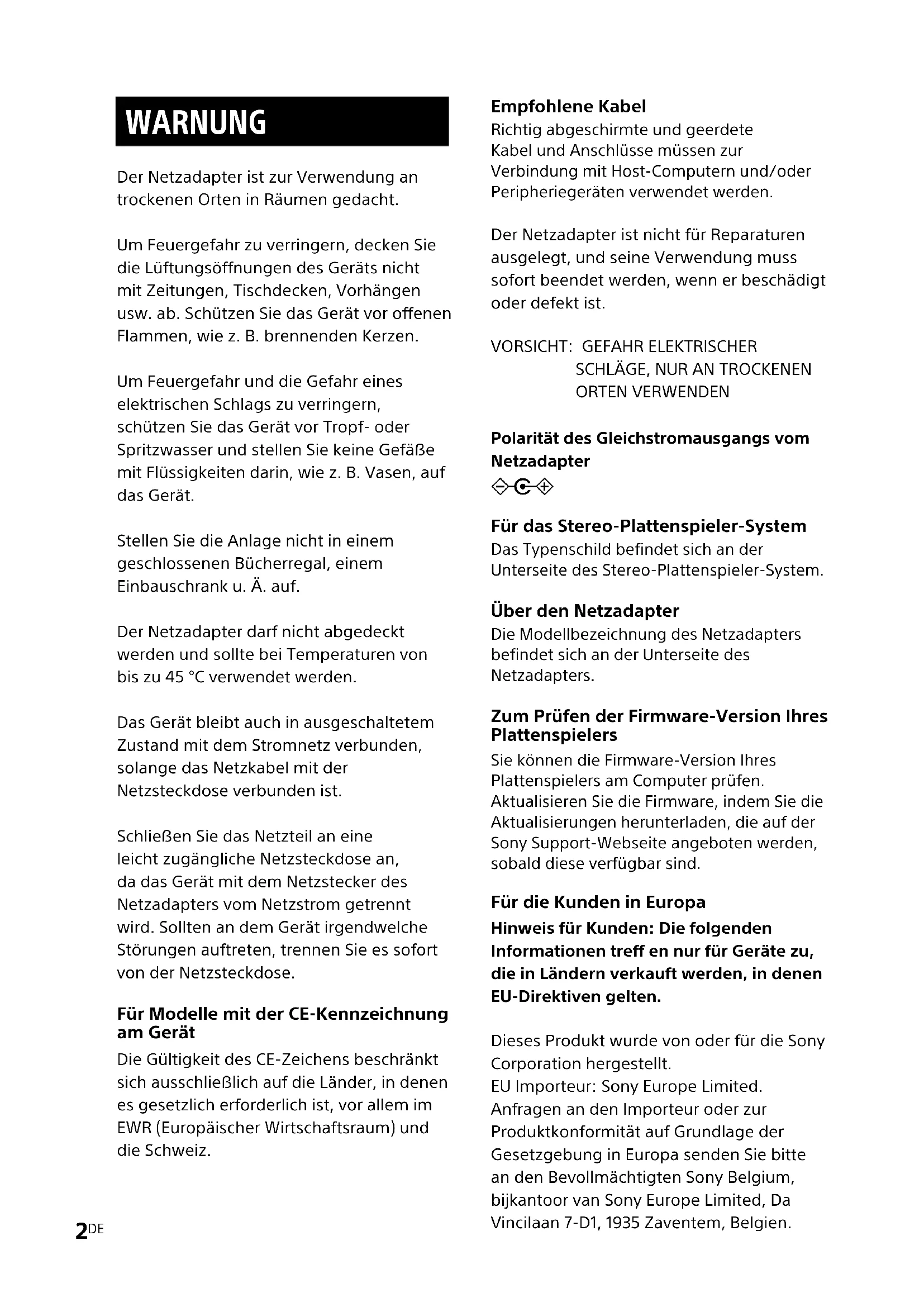 EU Importeur: Sony Europe Limited. Anfragen an den Importeur oder zur Produktkonformität auf Grundlage der Gesetzgebung in Europa senden Sie bitte an den Bevollmächtigten Sony Belgium, bijkantoor van Sony Europe Limited, Da Vincilaan 7-D1, 1935 Zaventem, Belgien.
