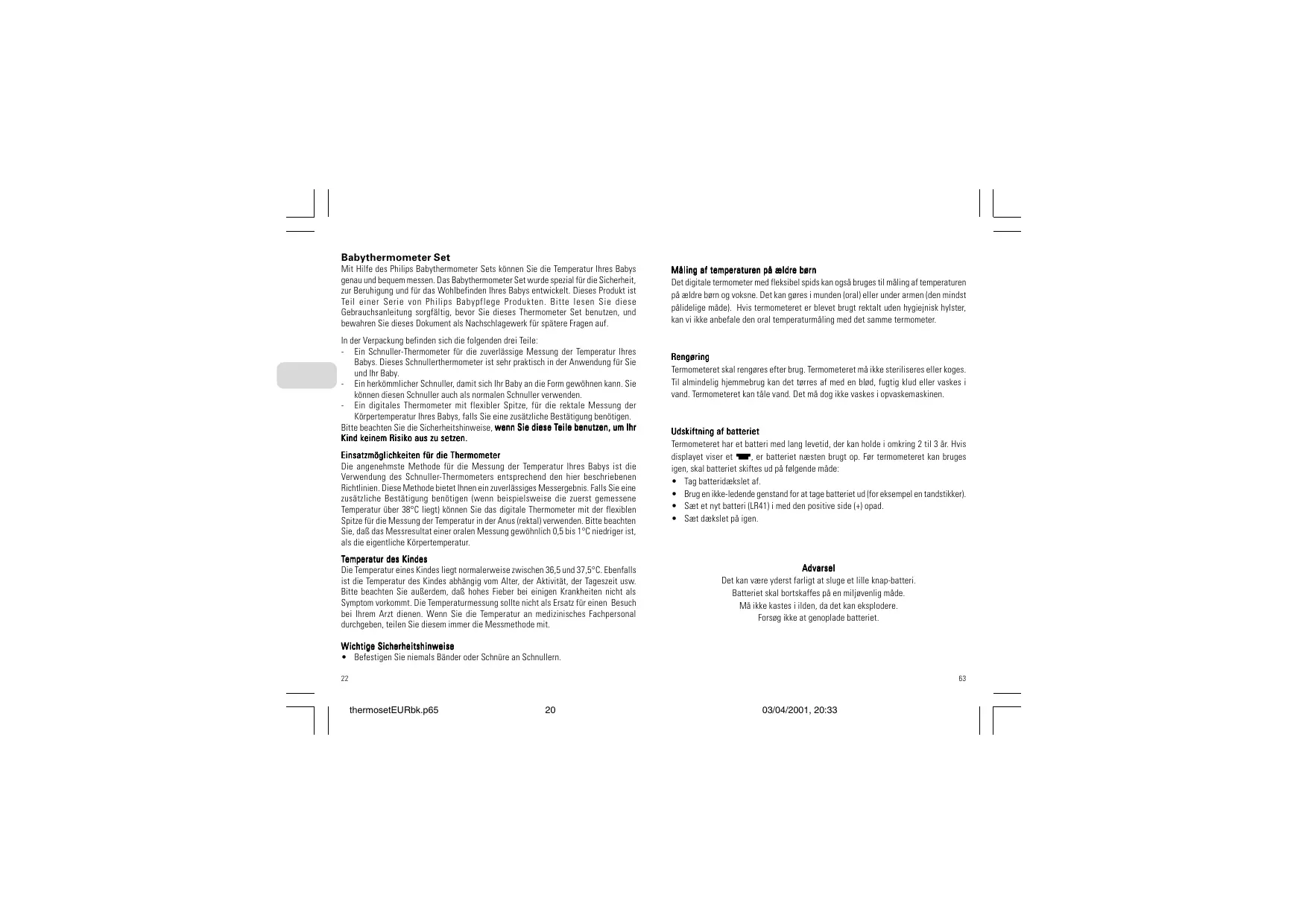 03/04/2001, 20:33 Babytermometer Med Philips babytermometer kan du nøjagtigt og nemt tage barnets temperatur. Babytermometeret er udviklet med henblik på barnets sikkerhed, komfort, velbefindende og er derfor også beroligende for dig selv. Det er en del af en komplet serie Philips Baby Care produkter. Du bør læse denne vejledning omhyggeligt igennem, før du bruger termometeret, og opbevare den et sted, så du hurtigt kan finde den igen. Æsken indeholder tre dele: - Et sut-termometer, så du præcist kan tage barnets temperatur. Det er meget praktisk i brug, både for dig og dit barn. - En almindelig sut, så barnet kan vænne sig til formen. Du kan også bruge denne sut som almindelig sut. - Et digitalt termometer med fleksibel spids, der måler barnets kropstemperatur rektalt, hvis du vil være mere sikker. Sørg for, at du følger sikkerhedsinstrukserne, når du bruger termometrene, så barnet ikke kommer til skade. Forskellige måder at br uge ter mometr ene på bruge termometr mometrene Den nemmeste måde at tage barnets temperatur er at bruge sut-termometeret, som beskrevet i denne vejledning. Denne metode giver en pålidelig indikation af barnets temperatur. Hvis du vil være ekstra sikker (for eksempel hvis den først målte temperatur er over 38°C), kan du bruge det digitale termometer med fleksibel spids og tage temperaturen i anus (rektalt). Vær opmærksom på, at den målte temperatur i munden almindeligvis er 0,5 til 1°C lavere end kroppens faktiske temperatur. Bør ns temperatur Børns Et barns temperatur er almindeligvis mellem 36,5 og 37,5°C. Glem ikke, at et barns temperatur kan variere med alderen, aktivitet, tidspunkt på dagen osv. Glem heller ikke, at visse sygdomme ikke giver sig udslag i feber og altså højere temperatur. Det er naturligvis ikke altid nok at tage barnets temperatur, ofte må man også søge læge. Når du fortæller en læge eller en sygeplejerske barnets temperatur, skal du også fortælle, hvordan du har taget temperaturen. Messung der TTemperatur emperatur bei älter en Kinder älteren Kindernn Bei älteren Kindern und Erwachsenen kann das Thermometer mit der flexiblen Spitze ebenfalls zur Bestimmung der Temperatur im Mund (oral) oder unter dem Arm (die unzuverlässigste Methode) verwendet werden. Wenn das Thermometer rektal ohne Hygieneüberzüge benutzt wird, sollte es nicht mehr für orale Messungen verwendet werden. Reinigung Reinigen Sie das Thermometer nach jedem Gebrauch. Desinfizieren Sie das Thermometer nicht und kochen Sie es nicht aus. Wischen Sie das Thermometer mit einem weichen, feuchten Tuch ab oder waschen Sie es in Wasser. Das Thermometer ist beständig gegen Wasser. Waschen Sie es nicht im Geschirrspüler. Austausch der Batterie (Knopfzelle) In diesem Thermometer ist eine Batterie mit sehr langer Lebensdauer eingebaut, deren Energie ca. 2 bis 3 Jahre hält. Wenn in der Anzeige ein sichtbar ist, ist die Batterie fast verbraucht. Tauschen Sie die Batterie dann vor dem Gebrauch des Thermometers wie nachfolgend beschrieben aus: