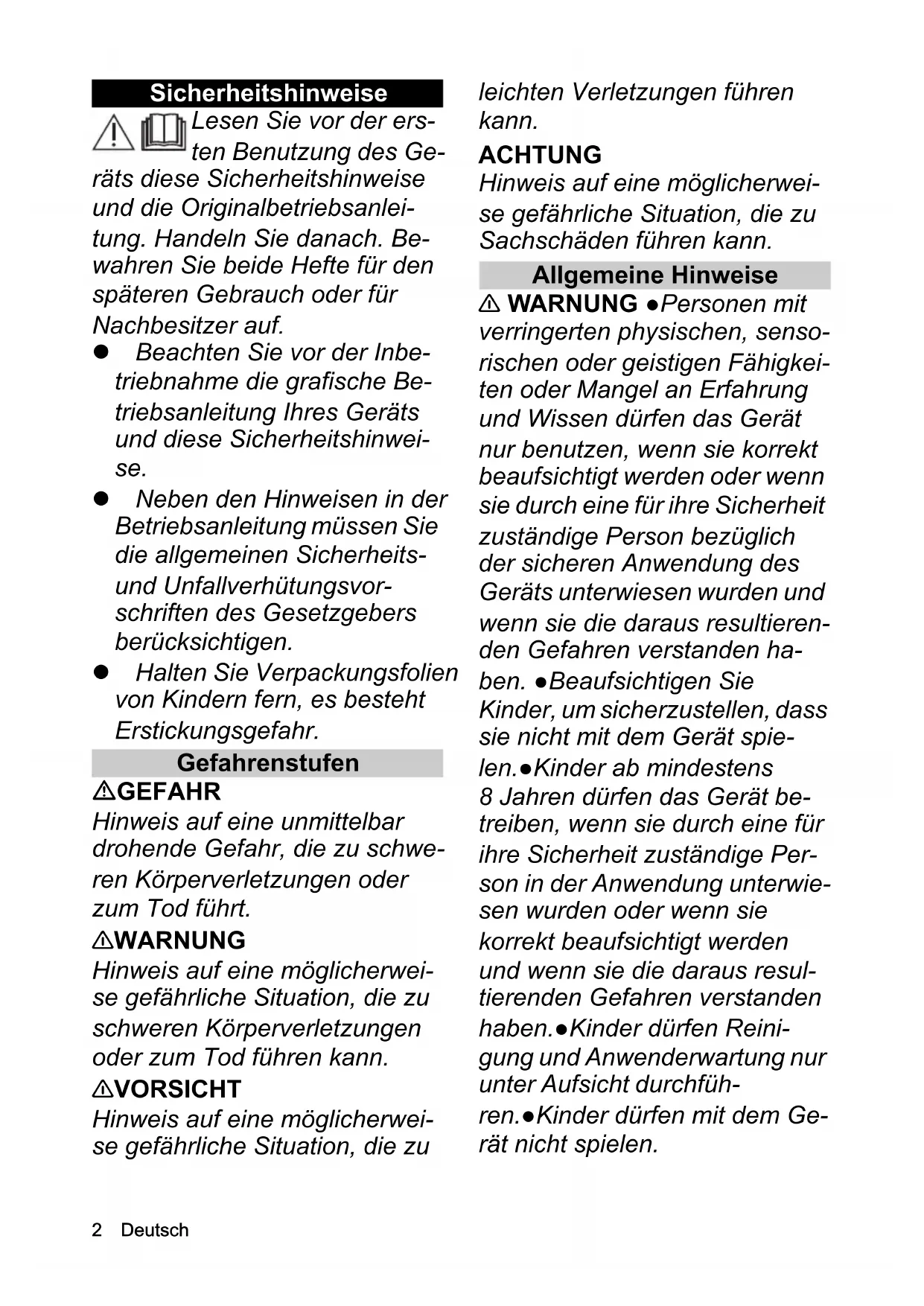 962 Deutsch Sicherheitshinweise Lesen Sie vor der ers- ten Benutzung des Ge- räts diese Sicherheitshinweise und die Originalbetriebsanlei- tung. Handeln Sie danach. Be- wahren Sie beide Hefte für den späteren Gebrauch oder für Nachbesitzer auf. Beachten Sie vor der Inbe- triebnahme die grafische Be- triebsanleitung Ihres Geräts und diese Sicherheitshinwei- se. Neben den Hinweisen in der Betriebsanleitung müssen Sie die allgemeinen Sicherheits- und Unfallverhütungsvor- schriften des Gesetzgebers berücksichtigen. Halten Sie Verpackungsfolien von Kindern fern, es besteht Erstickungsgefahr. Gefahrenstufen GEFAHR Hinweis auf eine unmittelbar drohende Gefahr, die zu schwe- ren Körperverletzungen oder zum Tod führt. 몇 WARNUNG Hinweis auf eine möglicherwei- se gefährliche Situation, die zu schweren Körperverletzungen oder zum Tod führen kann. 몇 VORSICHT Hinweis auf eine möglicherwei- se gefährliche Situation, die zu leichten Verletzungen führen kann. ACHTUNG Hinweis auf eine möglicherwei- se gefährliche Situation, die zu Sachschäden führen kann. Allgemeine Hinweise 몇 WARNUNG ●Personen mit verringerten physischen, senso- rischen oder geistigen Fähigkei- ten oder Mangel an Erfahrung und Wissen dürfen das Gerät nur benutzen, wenn sie korrekt beaufsichtigt werden oder wenn sie durch eine für ihre Sicherheit zuständige Person bezüglich der sicheren Anwendung des Geräts unterwiesen wurden und wenn sie die daraus resultieren- den Gefahren verstanden ha- ben. ●Beaufsichtigen Sie Kinder, um sicherzustellen, dass sie nicht mit dem Gerät spie- len.●Kinder ab mindestens 8 Jahren dürfen das Gerät be- treiben, wenn sie durch eine für ihre Sicherheit zuständige Per- son in der Anwendung unterwie- sen wurden oder wenn sie korrekt beaufsichtigt werden und wenn sie die daraus resul- tierenden Gefahren verstanden haben.●Kinder dürfen Reini- gung und Anwenderwartung nur unter Aufsicht durchfüh- ren.●Kinder dürfen mit dem Ge- rät nicht spielen.Deutsch 3 Stromschlaggefahr GEFAHR ●Fassen Sie Netz- stecker und Steckdose niemals mit feuchten Händen an.●Be- rühren Sie niemals Kontakte oder Leitungen.●Stecken Sie niemals leitende Gegenstände, z. B. Schraubendreher oder Ähnliches, in die Ladebuchse des Geräts.●Setzen Sie den Ak- ku keiner starken Sonnenein- strahlung, Hitze sowie Feuer aus.●Richten Sie den Sprüh- strahl nicht direkt auf Betriebs- mittel, die elektrische Bauteile enthalten, wie z. B. der Innen- raum von Öfen. 몇 WARNUNG ●Laden Sie das Gerät nur mit dem beiliegenden Originalladegerät oder einem von KÄRCHER zugelassenen Ladegerät.●Ersetzen Sie ein be- schädigtes Ladegerät mit Lade- kabel unverzüglich durch ein Originalteil. ●Laden Sie keine beschädigten Akkupacks. Erset- zen Sie beschädigte Akkupacks durch von KÄRCHER zugelas- sene Akkupacks. Gilt nicht für Geräte mit fest eingebautem Akku●Verwenden Sie das Ladegerät nur zum Laden zuge- lassener Akkupacks. ACHTUNG ●Kurzschlussgefahr . Bewahren Sie Akkupacks nicht zusammen mit Metallgegen- ständen auf.●Verwenden und lagern Sie das Ladegerät nur in trockenen Räumen.●Dieses Gerät enthält Akkus, die nicht austauschbar sind.Gilt nicht für Geräte mit austauschbarem Akkupack Hinweis ●Das Gerät enthält elektrische Bauteile, reinigen Sie das Gerät nicht unter flie- ßendem Wasser. Stellen Sie das Gerät nicht auf nassen Oberflächen ab. Bedienung GEFAHR ●Explosionsgefahr. Keine Batterien (Primärzellen) aufladen.●Werfen Sie Akku- packs nicht ins Feuer oder in den Hausmüll.●Vermeiden Sie den Kontakt mit aus defekten Akkus austretender Flüssigkeit. Spülen Sie die Flüssigkeit bei Kontakt sofort mit Wasser ab und konsultieren Sie bei Kontakt mit den Augen zusätzlich einen Arzt. 몇 WARNUNG ●Verletzungsgef ahr. Richten Sie den Sprühstrahl nicht auf die Augen. 몇 VORSICHT ●Verwenden Sie das Gerät nicht, wenn es zuvor heruntergefallen, sichtbar be- schädigt oder undicht ist. ACHTUNG ●Testen Sie das Wischtuch an einer nicht sicht- baren Stelle, bevor Sie den Fensterreiniger auf empfindli- chen (hochglänzenden) Ober- flächen anwenden.●Lagern Sie das Gerät nur in trockenen Räu- men.4 Deutsch Gilt nur für WV ACHTUNG ●Führen Sie keine Gegenstände in die Abluftöff- nung ein.● Schalten Sie das Ge- rät aus, sobald die MAX- Markierung des Schmutzwas- sertanks erreicht ist und leeren Sie den Schmutzwassertank. ●Lagern Sie das Gerät nur auf- recht stehend. Bestimmungsgemäße Verwendung Verwenden Sie das Gerät ausschließlich für den Privat- haushalt. Das akkubetriebene Gerät ist zur Reinigung von feuchten, glatten Oberflächen wie Fenster, Spiegel oder Fliesen bestimmt. Beachten Sie die Sicherheits- hinweise. Verwenden Sie das Gerät niemals zum Aufsaugen von Staub (gilt nur für WV). Saugen Sie maximal 25 ml Flüssigkeit auf. Das Ge- rät eignet sich nicht zum Aufsaugen größerer Flüs- sigkeitsmengen von horizontalen Oberflächen, z. B. einem umgefallenen Trinkglas (gilt nur für WV). Verwenden Sie das Gerät nur in Verbindung mit her- kömmlichen Fensterreinigungsmitteln (kein Spiritus, keine Schaumreiniger). Verwenden Sie das Gerät nur mit von KÄRCHER zugelassenem Zubehör und Ersatzteilen. Jede darüber hinausgehende Verwendung gilt als nicht bestimmungsgemäß. Für hieraus resultierende Schä- den haftet der Hersteller nicht; das Risiko hierfür trägt allein der Benutzer. Symbole Symbole auf dem Gerät Symbole in der Betriebsanleitung Lieferumfang Der Lieferumfang des Geräts ist auf der Verpackung ab- gebildet. Prüfen Sie beim Auspacken den Inhalt auf Vollständigkeit. Bei fehlendem Zubehör oder bei Trans- portschäden benachrichtigen Sie bitte Ihren Händler. Umweltschutz Die Verpackungsmaterialien sind recyclebar. Bit- te Verpackungen umweltgerecht entsorgen. Den Akku nur mit beiliegendem Originalladegerät oder einem von KÄRCHER zugelassenen Ladegerät laden. Nennspannung Akku Nennleistung Gerät Energieverbrauch Akku