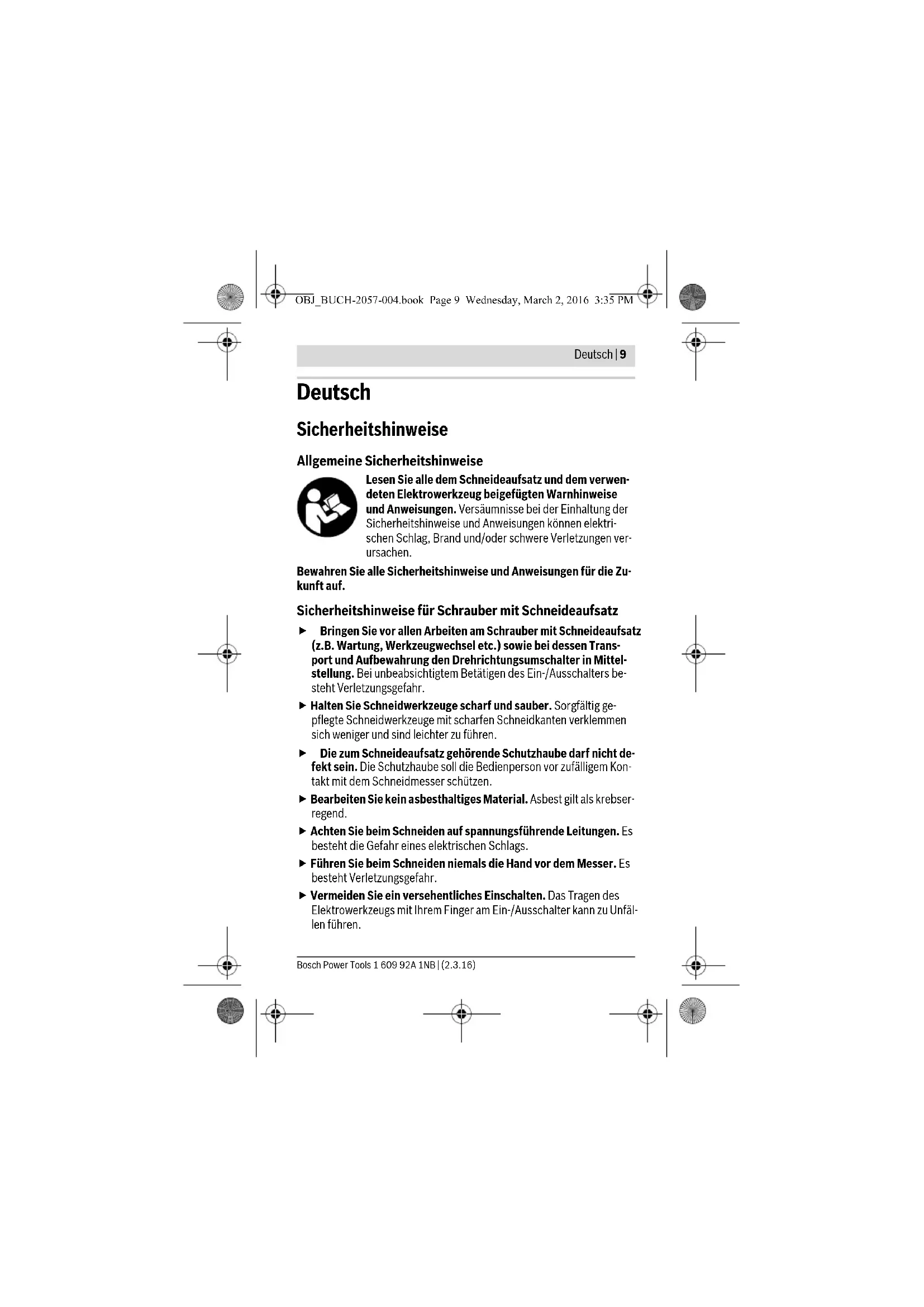 OBJ_BUCH-2057-004.book Page 8 Wednesday, February 24, 2016 8:51 AMDeutsch | 9 Bosch Power Tools 1 609 92A 1NB | (2.3.16) Deutsch Sicherheitshinweise Allgemeine Sicherheitshinweise Lesen Sie alle dem Schneideaufsatz und dem verwen- deten Elektrowerkzeug beigefügten Warnhinweise und Anweisungen. Versäumnisse bei der Einhaltung der Sicherheitshinweise und Anweisungen können elektri- schen Schlag, Brand und/oder schwere Verletzungen ver- ursachen. Bewahren Sie alle Sicherheitshinweise und Anweisungen für die Zu- kunft auf. Sicherheitshinweise für Schrauber mit Schneideaufsatz Bringen Sie vor allen Arbeiten am Schrauber mit Schneideaufsatz (z.B. Wartung, Werkzeugwechsel etc.) sowie bei dessen Trans- port und Aufbewahrung den Drehrichtungsumschalter in Mittel- stellung. Bei unbeabsichtigtem Betätigen des Ein-/Ausschalters be- steht Verletzungsgefahr. Halten Sie Schneidwerkzeuge scharf und sauber. Sorgfältig ge- pflegte Schneidwerkzeuge mit scharfen Schneidkanten verklemmen sich weniger und sind leichter zu führen. Die zum Schneideaufsatz gehörende Schutzhaube darf nicht de- fekt sein. Die Schutzhaube soll die Bedienperson vor zufälligem Kon- takt mit dem Schneidmesser schützen. Bearbeiten Sie kein asbesthaltiges Material. Asbest gilt als krebser- regend. Achten Sie beim Schneiden auf spannungsführende Leitungen. Es besteht die Gefahr eines elektrischen Schlags. Führen Sie beim Schneiden niemals die Hand vor dem Messer. Es besteht Verletzungsgefahr. Vermeiden Sie ein versehentliches Einschalten. Das Tragen des Elektrowerkzeugs mit Ihrem Finger am Ein-/Ausschalter kann zu Unfäl- len führen. OBJ_BUCH-2057-004.book Page 9 Wednesday, March 2, 2016 3:35 PM10 | Deutsch 1 609 92A 1NB | (2.3.16) Bosch Power Tools Beaufsichtigen Sie Kinder. Damit wird sichergestellt, dass Kinder nicht mit dem Schneideaufsatz oder mit dem Schrauber mit montier- tem Schneideaufsatz spielen. Dieser Schrauber mit Schneideaufsatz ist nicht vorgesehen für die Benutzung durch Kinder und Personen mit eingeschränkten physi- schen, sensorischen oder geistigen Fähigkeiten oder mangelnder Erfahrung und Wissen. Dieser Schrauber mit Schneideaufsatz kann von Kindern ab 8 Jah- ren und Personen mit eingeschränkten physischen, sensorischen oder geistigen Fähigkeiten oder mangelnder Erfahrung und Wis- sen benutzt werden, wenn sie durch eine für ihre Sicherheit ver- antwortliche Person beaufsichtigt werden oder von dieser im si- cheren Umgang mit dem Schrauber mit Schneideaufsatz eingewiesen worden sind und die damit verbundenen Gefahren verstehen. Andernfalls besteht die Gefahr von Fehlbedienung und Verletzungen. Produkt- und Leistungsbeschreibung Bestimmungsgemäßer Gebrauch Der Schneideaufsatz ist in Verbindung mit dem Akku-Schrauber IXO be- stimmt zum Schneiden von flexiblen, weichen Materialien bis zu einer Stärke von 6 mm, wie Teppich, PVC, Karton, Lederarten, Stoffe und ähn- liche Materialien. Der Schneideaufsatz ist nur für den privaten Gebrauch im Haushalt be- stimmt und darf nur in Verbindung mit folgenden Elektrowerkzeugen be- nutzt werden: – Bosch IXO (3 603 J81 0.., 3 603 J59 3.., 3 603 JA8 0..) Abgebildete Komponenten Die Nummerierung der abgebildeten Komponenten bezieht sich auf die Darstellungen auf den Grafikseiten. 1 Schneideaufsatz 2 Führungskufe 3 Schutzhaube 4 Entriegelungsring 5 Drehrichtungsumschalter OBJ_BUCH-2057-004.book Page 10 Wednesday, March 2, 2016 3:35 PMDeutsch | 11 Bosch Power Tools 1 609 92A 1NB | (2.3.16) 6 Ein-/Ausschalter 7 Schraube für Messerbefestigung 8 Schneidmesser 9 Gummikappe Abgebildetes oder beschriebenes Zubehör gehört nicht zum Standard-Liefer- umfang. Das vollständige Zubehör finden Sie in unserem Zubehörprogramm. Technische Daten Konformitätserklärung Wir erklären in alleiniger Verantwortung, dass das unter „Technische Da- ten“ beschriebene Produkt allen einschlägigen Bestimmungen der Richt- linie 2006/42/EG einschließlich ihrer Änderungen entspricht. Technische Unterlagen (2006/42/EG) bei: Robert Bosch Power Tools GmbH, PT/ETM9, 70538 Stuttgart, GERMANY Robert Bosch Power Tools GmbH70538 Stuttgart, GERMANYStuttgart, 01.01.2017 Montage Bringen Sie vor allen Arbeiten am Schrauber mit Schneideaufsatz (z.B. Wartung, Werkzeugwechsel etc.) sowie bei dessen Trans- port und Aufbewahrung den Drehrichtungsumschalter in Mittel- stellung. Bei unbeabsichtigtem Betätigen des Ein-/Ausschalters be- steht Verletzungsgefahr. Schneideaufsatz Cutter Sachnummer 1 600 A00 1YN Gewicht entsprechend EPTA- Procedure 01:2014 kg 0,15 Henk Becker Executive Vice President Engineering Helmut Heinzelmann Head of Product Certification PT/ETM9 OBJ_BUCH-2057-004.book Page 11 Wednesday, March 2, 2016 3:35 PM12 | Deutsch 1 609 92A 1NB | (2.3.16) Bosch Power Tools Schneideaufsatz aufstecken (siehe Bilder A1–A2) – Vor der Montage des Schneideaufsatzes 1 müssen Sie die Gummikap- pe 9 des Schraubers nach vorne abziehen. – Anschließend stecken Sie den Schneideaufsatz auf den Schrauber. Der Schneideaufsatz muss hörbar einrasten. Hinweis: Sie können den Schneideaufsatz in 8 verschiedenen Stellungen aufstecken. Dadurch erreichen Sie die jeweils optimale Arbeitsposition, z. B. zum Schneiden eines Bodenbelags entlang einer Wand. Demontage (siehe Bilder B1–B2) – Drehen Sie den Entriegelungsring 4 in Drehrichtung und ziehen Sie den Schneideaufsatz nach vorne () ab. – Stecken Sie anschließend die Gummikappe 9 wieder auf den Schrau- ber. Schneidmesser wechseln (siehe Bilder C1–C2) Hinweis: Nehmen Sie den Austausch des Schneidmessers nur vor, wenn der Schneideaufsatz am Schrauber montiert ist. Dadurch ist die Werk- zeugspindel blockiert und die Schraube für die Messerbefestigung lässt sich lösen. – Bringen Sie den Drehrichtungsumschalter 5 in Mittelstellung. – Lösen Sie die Schraube für die Messerbefestigung