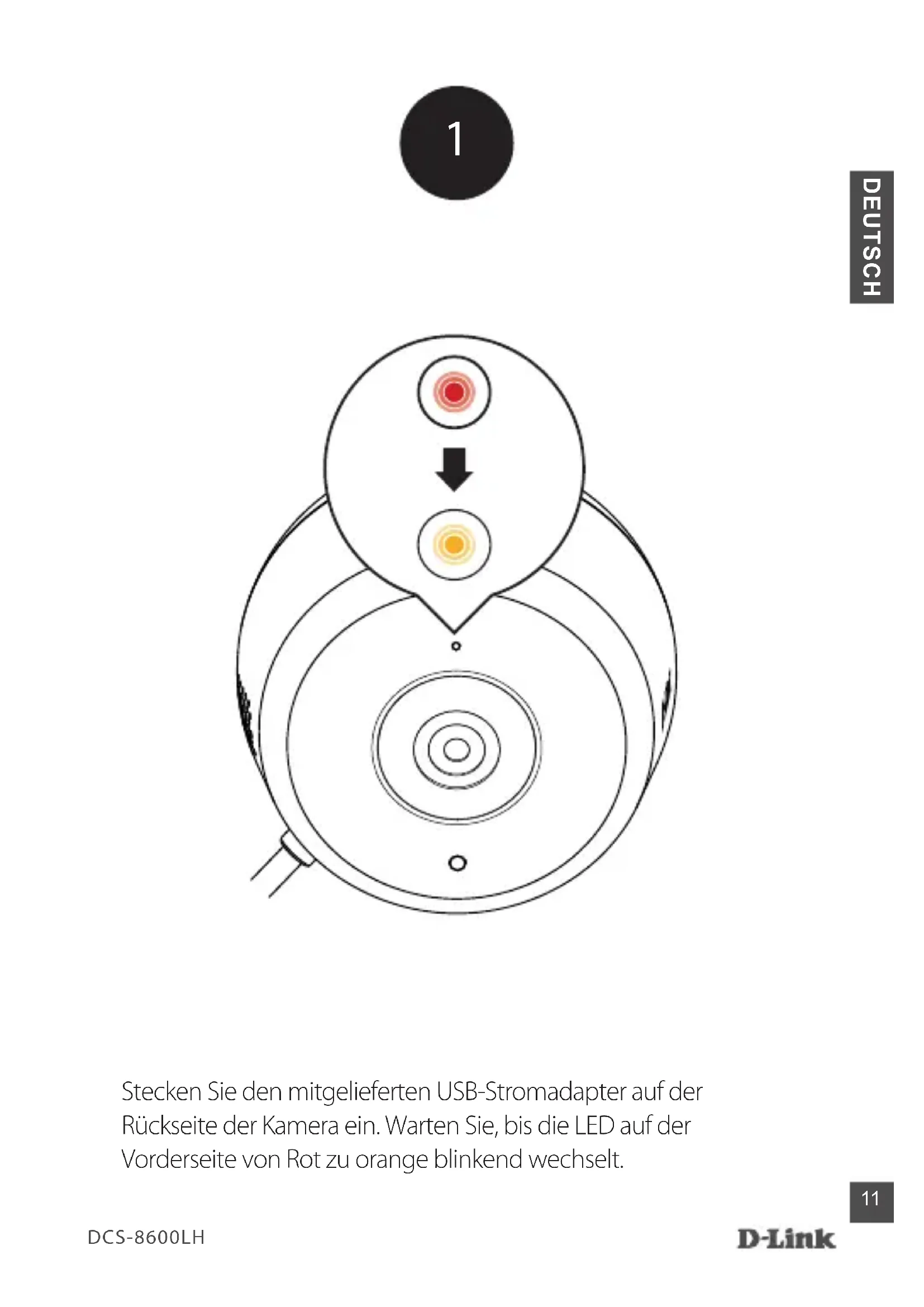 Stecken Sie den mitgelieferten USB-Stromadapter auf der Rückseite der Kamera ein. Warten Sie, bis die LED auf der Vorderseite von Rot zu orange blinkend wechselt.DCS-8600LH
