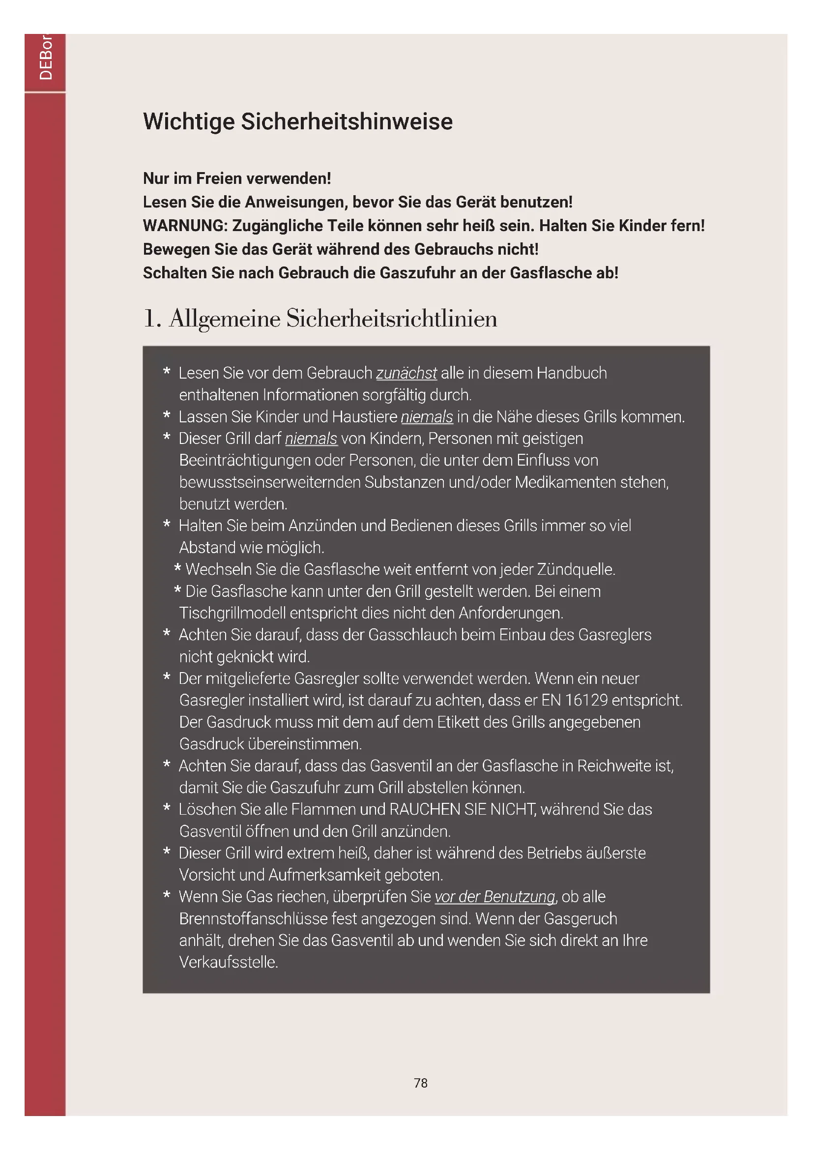 - 6. Umweltleitfaden, Gewährleistungsbedingungen und Kontaktinformationen ...... 9878 DEBoretti Maggiore An / Benutzerhandbuch – Installationshinweise Wichtige Sicherheitshinweise Nur im Freien verwenden! Lesen Sie die Anweisungen, bevor Sie das Gerät benutzen! WARNUNG: Zugängliche Teile können sehr heiß sein. Halten Sie Kinder fern! Bewegen Sie das Gerät während des Gebrauchs nicht! Schalten Sie nach Gebrauch die Gaszufuhr an der Gasflasche ab!