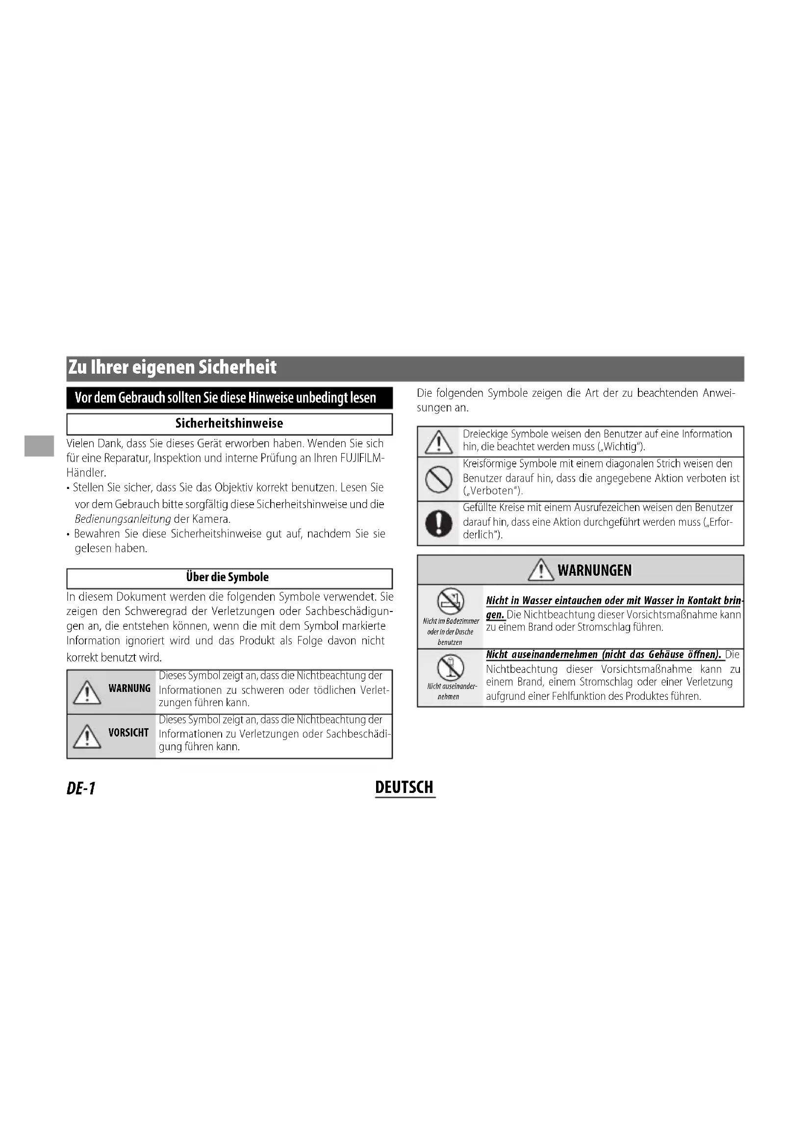 - distance à partir du plan d’appui de la monture d’objectif de l’appareil photo ⌀64,5× 33,7mm ⌀65,0× 50,4mm ⌀64,1× 63,6mm Poids* (environ) *sans les bouchons et le pare-soleil 116g 187g 215g Diamètre du ltre ⌀52mm ⌀52mm ⌀39mm Q Des améliorations peuvent être apportées aux caractéristiques et au design sans avis préalable. Q Du fait de la construction de l’objectif, « l’indicateur de distance » affi ché par l’appareil photo peut dans certains cas diff érer de la distance de mise au point réelle. N’utilisez « l’indicateur de distance » qu’à titre indicatif.DE-1 DEUTSCH Zu Ihrer eigenen Sicherheit Vor dem Gebrauch sollten Sie diese Hinweise unbedingt lesen Sicherheitshinweise Vielen Dank, dass Sie dieses Gerät erworben haben. Wenden Sie sich für eine Reparatur, Inspektion und interne Prüfung an Ihren FUJIFILM-Händler.• Stellen Sie sicher, dass Sie das Objektiv korrekt benutzen. Lesen Sie vor dem Gebrauch bitte sorgfältig diese Sicherheitshinweise und die Bedienungsanleitung der Kamera.• Bewahren Sie diese Sicherheitshinweise gut auf, nachdem Sie sie gelesen haben. Über die Symbole In diesem Dokument werden die folgenden Symbole verwendet. Sie zeigen den Schweregrad der Verletzungen oder Sachbeschädigun-gen an, die entstehen können, wenn die mit dem Symbol markierte Information ignoriert wird und das Produkt als Folge davon nicht korrekt benutzt wird.WARNUNGDieses Symbol zeigt an, dass die Nichtbeachtung der Informationen zu schweren oder tödlichen Verlet-zungen führen kann.VORSICHTDieses Symbol zeigt an, dass die Nichtbeachtung der Informationen zu Verletzungen oder Sachbeschädi-gung führen kann.Die folgenden Symbole zeigen die Art der zu beachtenden Anwei-sungen an.Dreieckige Symbole weisen den Benutzer auf eine Information hin, die beachtet werden muss („Wichtig“).Kreisförmige Symbole mit einem diagonalen Strich weisen den Benutzer darauf hin, dass die angegebene Aktion verboten ist („Verboten“).Gefüllte Kreise mit einem Ausrufezeichen weisen den Benutzer darauf hin, dass eine Aktion durchgeführt werden muss („Erfor-derlich“).