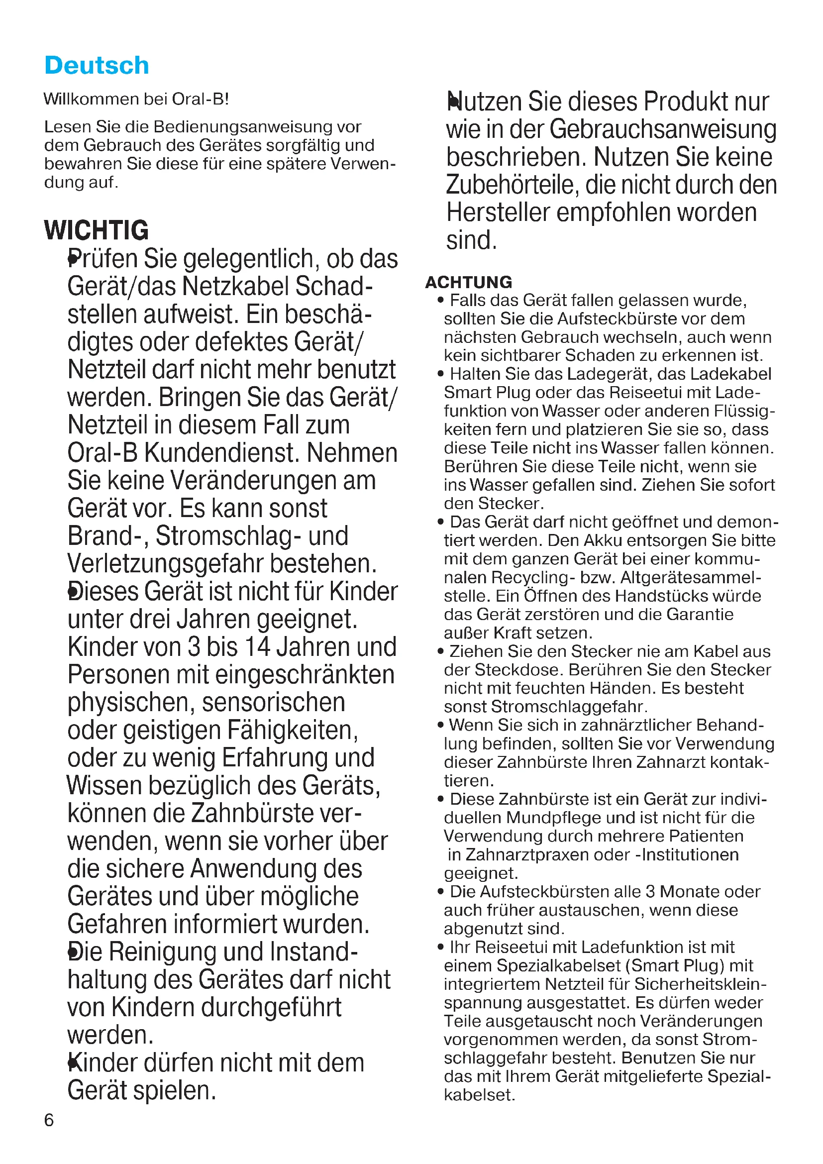 Dieses Gerät ist nicht für Kinder unter drei Jahren geeignet. Kinder von 3 bis 14 Jahren und Personen mit eingeschränkten physischen, sensorischen oder geistigen Fähigkeiten, oder zu wenig Erfahrung und Wissen bezüglich des Geräts, können die Zahnbürste ver- wenden, wenn sie vorher über die sichere Anwendung des Gerätes und über mögliche Gefahren informiert wurden.