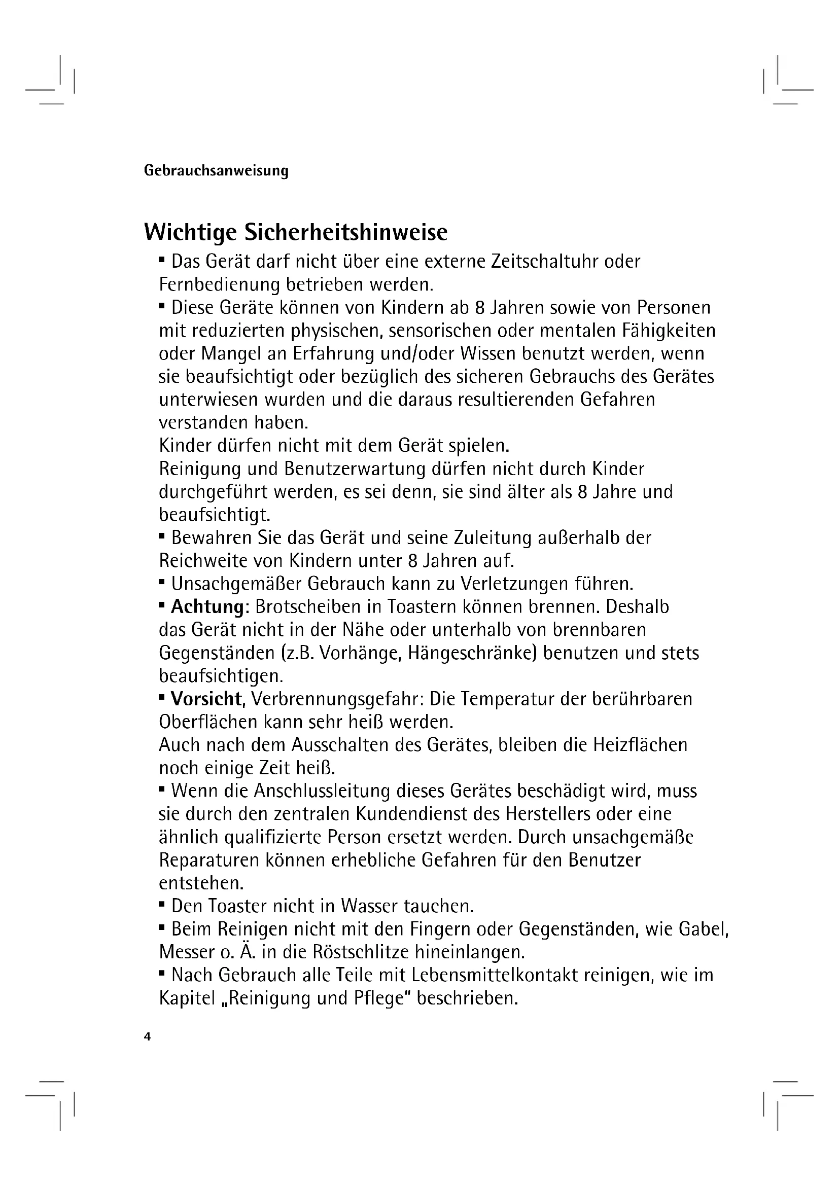 - Achtung: Brotscheiben in Toastern konnen brennen. Deshalb das Gerät nicht in der Nähe oder unterhalb von brennbaren Gegenständen (z.B. Vorhänge, Hängeschränke) benutzen und stets beaufsichtigen.