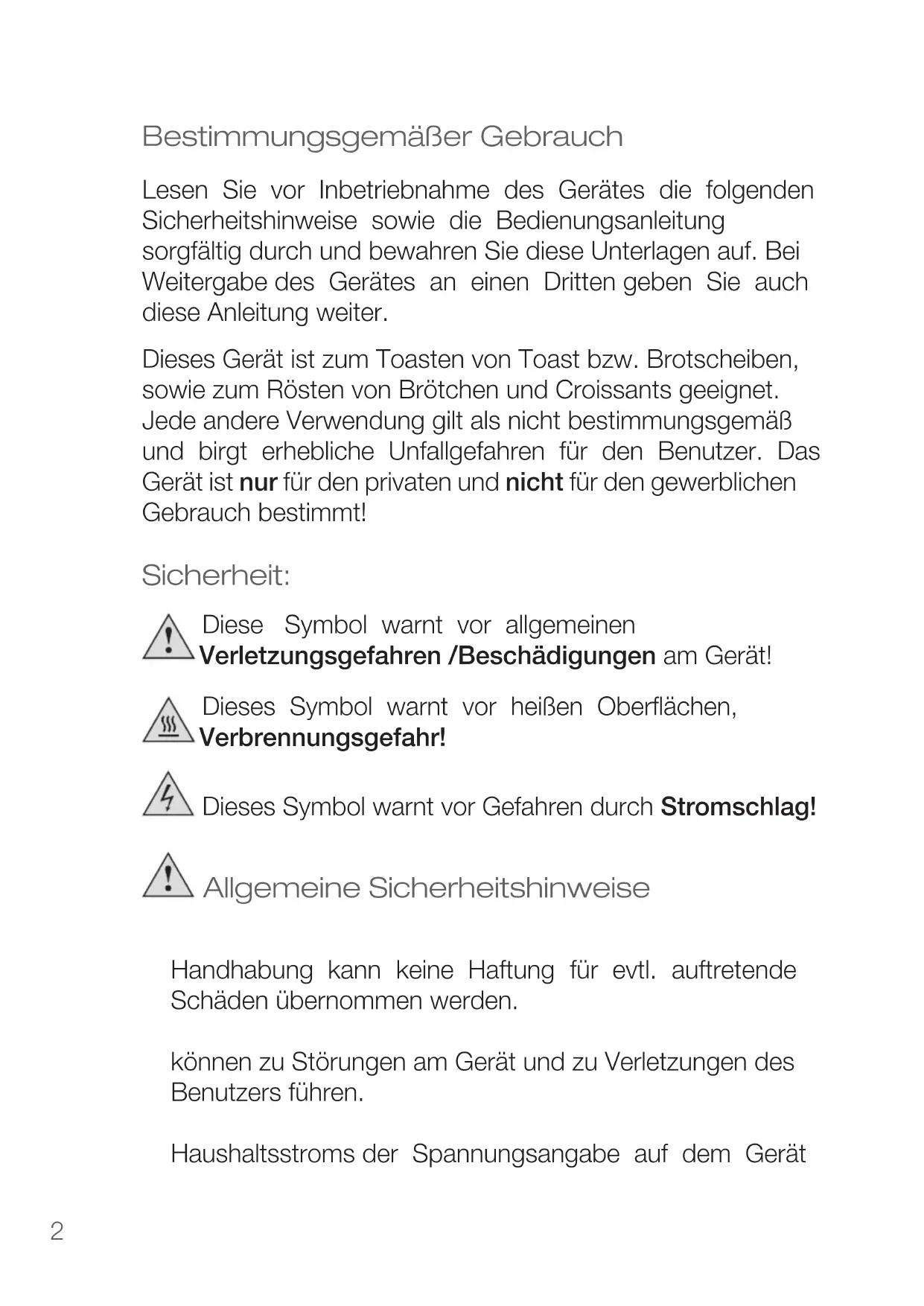 Dieses Gerät ist zum Toasten von Toast bzw. Brotscheiben, sowie zum Rösten von Brötchen und Croissants geeignet. Jede andere Verwendung gilt als nicht bestimmungsgemäß und birgt erhebliche Unfallgefahren für den Benutzer. Das Gerät ist nur für den privaten und nicht für den gewerblichen Gebrauch bestimmt!