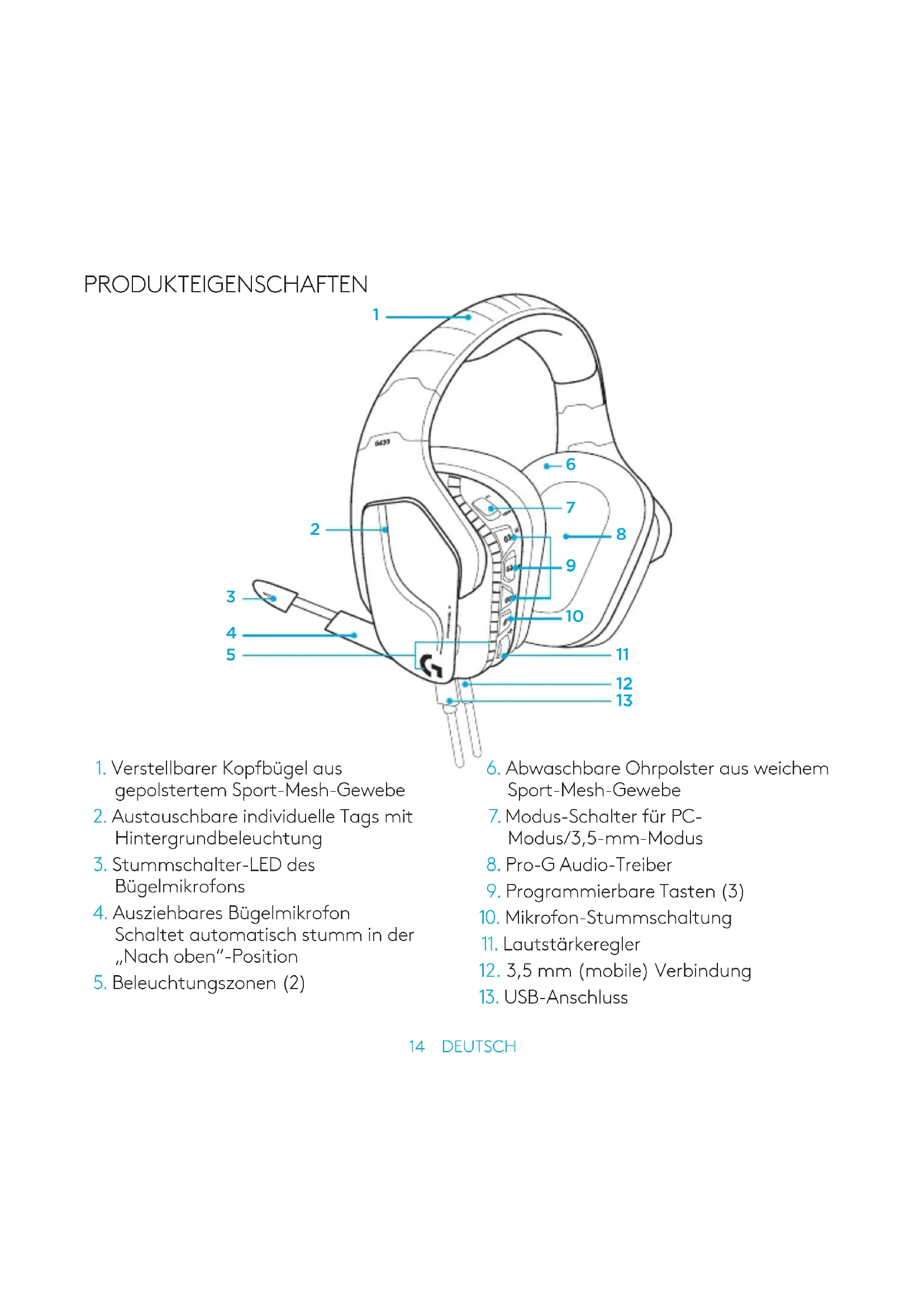 Die linken und die rechten Tags können entfernt und durch individuelle Tags ersetzt werden. LOGITECHGHUB SOFTWARE Prole für G-Tasten, Beleuchtung, Equalizer und Surround Sound lassen sich programmieren über die Logitech G HUB Software.