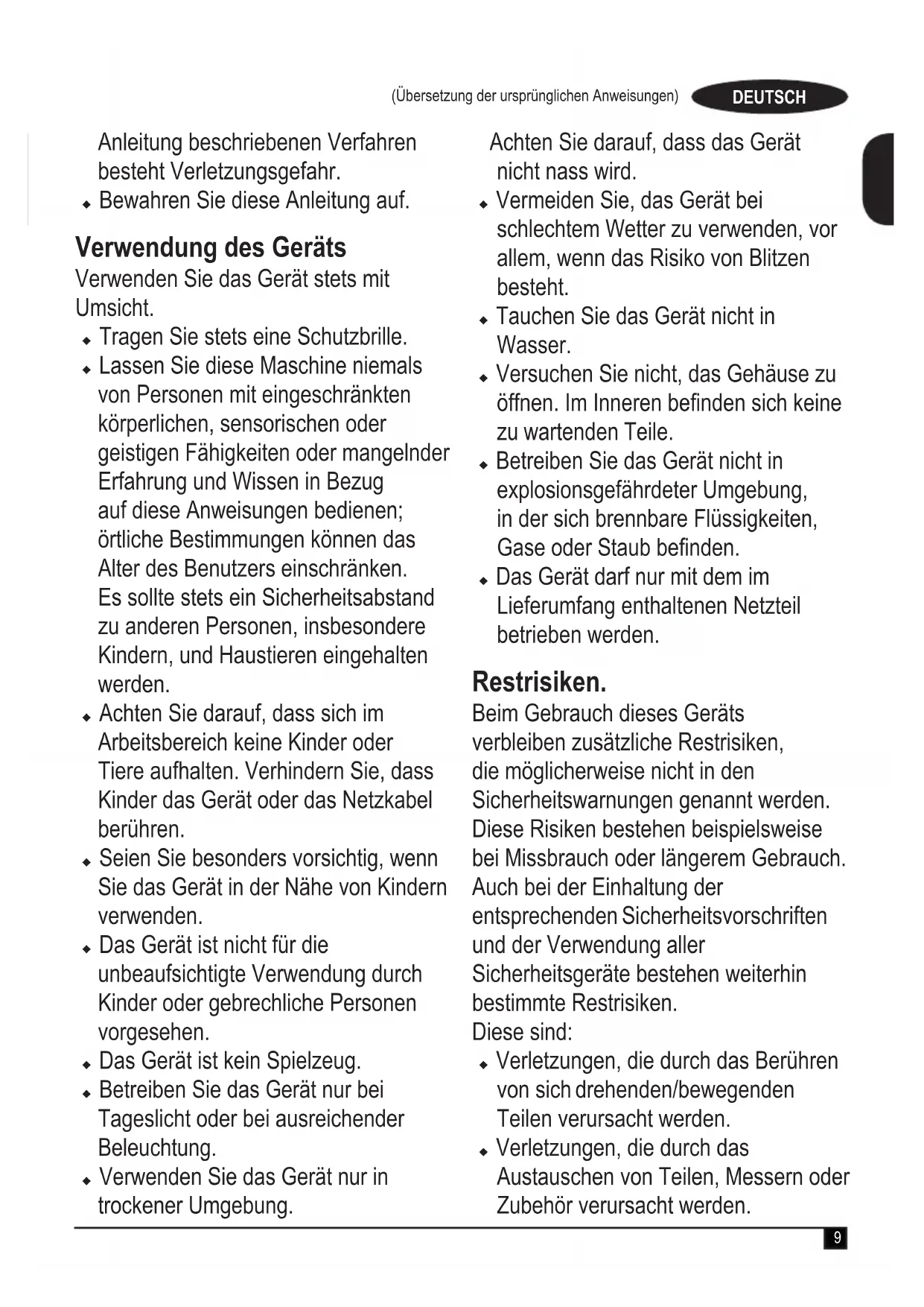 (guaranteed sound power) 100 dB(A) These products also comply with Directive 2014/30/EU, 2011/65/EU. For more information, please contact Black & Decker at the following address or refer to the back of the manual. The undersigned is responsible for compilation of the technical le and makes this declaration on behalf of Black & Decker. R. Laverick Director of Engineering Black & Decker Europe, 210 Bath Road, Slough, Berkshire, SL1 3YD United Kingdom 21/08/20189 (Übersetzung der ursprünglichen Anweisungen) DEUTSCH Anleitung beschriebenen Verfahren besteht Verletzungsgefahr. u Bewahren Sie diese Anleitung auf. Verwendung des Geräts Verwenden Sie das Gerät stets mit Umsicht. u Tragen Sie stets eine Schutzbrille. u Lassen Sie diese Maschine niemals von Personen mit eingeschränkten körperlichen, sensorischen oder geistigen Fähigkeiten oder mangelnder Erfahrung und Wissen in Bezug auf diese Anweisungen bedienen; örtliche Bestimmungen können das Alter des Benutzers einschränken. Es sollte stets ein Sicherheitsabstand zu anderen Personen, insbesondere Kindern, und Haustieren eingehalten werden. u Achten Sie darauf, dass sich im Arbeitsbereich keine Kinder oder Tiere aufhalten. Verhindern Sie, dass Kinder das Gerät oder das Netzkabel berühren. u Seien Sie besonders vorsichtig, wenn Sie das Gerät in der Nähe von Kindern verwenden. u Das Gerät ist nicht für die unbeaufsichtigte Verwendung durch Kinder oder gebrechliche Personen vorgesehen. u Das Gerät ist kein Spielzeug. u Betreiben Sie das Gerät nur bei Tageslicht oder bei ausreichender Beleuchtung. u Verwenden Sie das Gerät nur in trockener Umgebung. Achten Sie darauf, dass das Gerät nicht nass wird. u Vermeiden Sie, das Gerät bei schlechtem Wetter zu verwenden, vor allem, wenn das Risiko von Blitzen besteht. u Tauchen Sie das Gerät nicht in Wasser. u Versuchen Sie nicht, das Gehäuse zu öffnen. Im Inneren benden sich keine zu wartenden Teile. u Betreiben Sie das Gerät nicht in explosionsgefährdeter Umgebung, in der sich brennbare Flüssigkeiten, Gase oder Staub benden. u Das Gerät darf nur mit dem im Lieferumfang enthaltenen Netzteil betrieben werden. Restrisiken. Beim Gebrauch dieses Geräts verbleiben zusätzliche Restrisiken, die möglicherweise nicht in den Sicherheitswarnungen genannt werden. Diese Risiken bestehen beispielsweise bei Missbrauch oder längerem Gebrauch. Auch bei der Einhaltung der entsprechenden Sicherheitsvorschriften und der Verwendung aller Sicherheitsgeräte bestehen weiterhin bestimmte Restrisiken. Diese sind: u Verletzungen, die durch das Berühren von sich drehenden/bewegenden Teilen verursacht werden. u Verletzungen, die durch das Austauschen von Teilen, Messern oder Zubehör verursacht werden.10 (Übersetzung der ursprünglichen Anweisungen) DEUTSCH u Verletzungen, die durch längeren Gebrauch eines Geräts verursacht werden. Legen Sie bei längerem Gebrauch regelmäßige Pausen ein. u Beeinträchtigung des Gehörs. u Gesundheitsrisiken durch das Einatmen von Staub beim Verwenden des Geräts (beispielsweise bei Holzarbeiten, insbesondere Eiche, Buche und MDF.) Gebrauch und Pege von Geräten u Prüfen Sie das Gerät vor der Verwendung auf beschädigte oder defekte Teile. Prüfen Sie, ob Teile gebrochen sind, Schalter beschädigt sind oder andere Bedingungen vorliegen, welche die Funktion beeinträchtigen könnten. u Betreiben Sie das Gerät nicht, wenn der Schalter zum Ein- und Ausschalten nicht funktioniert. Ein Gerät, das sich nicht mehr ein- oder ausschalten lässt, ist gefährlich und muss repariert werden. u Ziehen Sie den Stecker aus der Steckdose, und/oder trennen Sie das Gerät vom Akku, bevor Sie Einstellungen vornehmen, Zubehörteile wechseln oder das Gerät lagern. Diese Vorsichtsmaßnahmen verhindern den unbeabsichtigten Start des Geräts. u Halten Sie ggf. die Schneidwerkzeuge scharf und sauber. Richtig gewartete Schneidwerkzeuge mit scharfen Klingen blockieren seltener und sind leichter unter Kontrolle zu halten. u Betreiben Sie das Gerät nicht, wenn ein Teil beschädigt oder defekt ist. u Lassen Sie beschädigte oder defekte Teile in einer Vertragswerkstatt reparieren oder austauschen. u Ersetzen oder entfernen Sie keine Teile, für die in dieser Anleitung keine entsprechende Beschreibung enthalten ist. Elektrische Sicherheit u Der Netzstecker des Geräts muss in die Steckdose passen. Ändern Sie niemals den Stecker in irgendeiner Form. Verwenden Sie für schutzgeerdete Geräte keine Adapterstecker. Unveränderte Stecker und passende Steckdosen mindern die Gefahr eines elektrischen Schlages. u Schützen Sie das Gerät vor Regen und Feuchtigkeit. Das Eindringen von Wasser in das Gerät erhöht das Risiko eines elektrischen Schlags. u Verwenden Sie das Kabel ordnungsgemäß. Verwenden Sie das Kabel niemals zum Tragen. Trennen Sie das Gerät nicht durch Ziehen am Kabel vom Netz. Halten Sie das Kabel fern von Hitze, Öl, scharfen Kanten oder beweglichen Teilen. Beschädigte oder verhedderte Kabel erhöhen die Gefahr eines elektrischen Schlages.11 (Übersetzung der ursprünglichen Anweisungen) DEUTSCH u Verwenden Sie nur für den Außenbereich zugelassene Verlängerungskabel, wenn Sie mit dem Gerät im Freien arbeiten. Die Verwendung eines für den Außenbereich geeigneten Verlängerungskabels verringert das Risiko eines elektrischen Schlags. u Wenn ein Gerät in einer feuchten Umgebung verwendet werden muss, schließen Sie es unbedingt an eine Steckdose mit Fehlerstromschutzschalter (FI-Schalter) an. Ein Fehlerstromschutzschalter verringert das Risiko eines elektrischen Schlags. Nach dem Gebrauch u Bewahren Sie das Gerät bei Nichtgebrauch an einem trockenen, gut belüfteten Ort außerhalb der Reichweite von Kindern auf. u Kinder sollten keinen Zugang zu aufbewahrten Geräten haben. u Wenn das Gerät in einem Fahrzeug transportiert oder gelagert wird, bewahren Sie es im Kofferraum oder einer geeigneten Ablage auf, damit es bei plötzlichen Geschwindigkeits- oder Richtungsänderun
