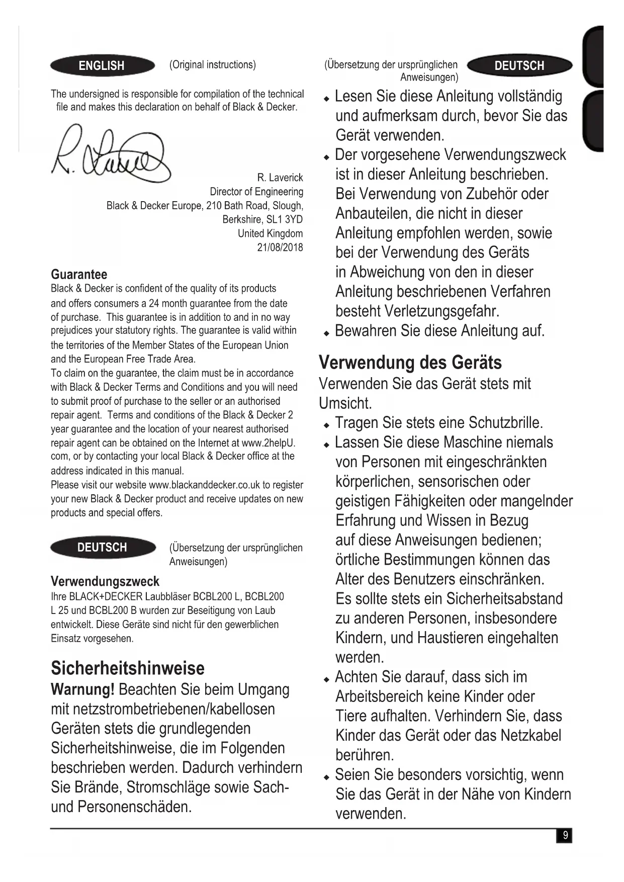 (guaranteed sound power) 91 dB(A) These products also comply with Directive 2014/30/EU, 2011/65/EU. For more information, please contact Black & Decker at the following address or refer to the back of the manual.9 (Übersetzung der ursprünglichen Anweisungen) DEUTSCH ENGLISH (Original instructions) (Übersetzung der ursprünglichen Anweisungen) DEUTSCH Verwendungszweck Ihre BLACK+DECKER Laubbläser BCBL200 L, BCBL200 L 25 und BCBL200 B wurden zur Beseitigung von Laub entwickelt. Diese Geräte sind nicht für den gewerblichen Einsatz vorgesehen. Sicherheitshinweise Warnung! Beachten Sie beim Umgang mit netzstrombetriebenen/kabellosen Geräten stets die grundlegenden Sicherheitshinweise, die im Folgenden beschrieben werden. Dadurch verhindern Sie Brände, Stromschläge sowie Sach- und Personenschäden. u Lesen Sie diese Anleitung vollständig und aufmerksam durch, bevor Sie das Gerät verwenden. u Der vorgesehene Verwendungszweck ist in dieser Anleitung beschrieben. Bei Verwendung von Zubehör oder Anbauteilen, die nicht in dieser Anleitung empfohlen werden, sowie bei der Verwendung des Geräts in Abweichung von den in dieser Anleitung beschriebenen Verfahren besteht Verletzungsgefahr. u Bewahren Sie diese Anleitung auf. Verwendung des Geräts Verwenden Sie das Gerät stets mit Umsicht. u Tragen Sie stets eine Schutzbrille.u Lassen Sie diese Maschine niemals von Personen mit eingeschränkten körperlichen, sensorischen oder geistigen Fähigkeiten oder mangelnder Erfahrung und Wissen in Bezug auf diese Anweisungen bedienen; örtliche Bestimmungen können das Alter des Benutzers einschränken. Es sollte stets ein Sicherheitsabstand zu anderen Personen, insbesondere Kindern, und Haustieren eingehalten werden. u Achten Sie darauf, dass sich im Arbeitsbereich keine Kinder oder Tiere aufhalten. Verhindern Sie, dass Kinder das Gerät oder das Netzkabel berühren. u Seien Sie besonders vorsichtig, wenn Sie das Gerät in der Nähe von Kindern verwenden. The undersigned is responsible for compilation of the technical le and makes this declaration on behalf of Black & Decker. R. Laverick Director of Engineering Black & Decker Europe, 210 Bath Road, Slough, Berkshire, SL1 3YD United Kingdom 21/08/2018 Guarantee Black & Decker is condent of the quality of its products and offers consumers a 24 month guarantee from the date of purchase. This guarantee is in addition to and in no way prejudices your statutory rights. The guarantee is valid within the territories of the Member States of the European Union and the European Free Trade Area. To claim on the guarantee, the claim must be in accordance with Black & Decker Terms and Conditions and you will need to submit proof of purchase to the seller or an authorised repair agent. Terms and conditions of the Black & Decker 2 year guarantee and the location of your nearest authorised repair agent can be obtained on the Internet at www.2helpU. com, or by contacting your local Black & Decker ofce at the address indicated in this manual. Please visit our website www.blackanddecker.co.uk to register your new Black & Decker product and receive updates on new products and special offers.10 (Übersetzung der ursprünglichen Anweisungen) DEUTSCH u Das Gerät ist nicht für die unbeaufsichtigte Verwendung durch Kinder oder gebrechliche Personen vorgesehen. u Das Gerät ist kein Spielzeug. u Betreiben Sie das Gerät nur bei Tageslicht oder bei ausreichender Beleuchtung. u Verwenden Sie das Gerät nur in trockener Umgebung. Achten Sie darauf, dass das Gerät nicht nass wird. u Vermeiden Sie, das Gerät bei schlechtem Wetter zu verwenden, vor allem, wenn das Risiko von Blitzen besteht. u Tauchen Sie das Gerät nicht in Wasser. u Versuchen Sie nicht, das Gehäuse zu öffnen. Im Inneren benden sich keine zu wartenden Teile. u Betreiben Sie das Gerät nicht in explosionsgefährdeter Umgebung, in der sich brennbare Flüssigkeiten, Gase oder Staub benden. u Das Gerät darf nur mit dem im Lieferumfang enthaltenen Netzteil betrieben werden. Restrisiken. Beim Gebrauch dieses Geräts verbleiben zusätzliche Restrisiken, die möglicherweise nicht in den Sicherheitswarnungen genannt werden. Diese Risiken bestehen beispielsweise bei Missbrauch oder längerem Gebrauch. Auch bei der Einhaltung der entsprechenden Sicherheitsvorschriften und der Verwendung aller Sicherheitsgeräte bestehen weiterhin bestimmte Restrisiken. Diese sind: u Verletzungen, die durch das Berühren von sich drehenden/bewegenden Teilen verursacht werden. u Verletzungen, die durch das Austauschen von Teilen, Messern oder Zubehör verursacht werden. u Verletzungen, die durch längeren Gebrauch eines Geräts verursacht werden. Legen Sie bei längerem Gebrauch regelmäßige Pausen ein. u Beeinträchtigung des Gehörs. u Gesundheitsrisiken durch das Einatmen von Staub beim Verwenden des Geräts (beispielsweise bei Holzarbeiten, insbesondere Eiche, Buche und MDF.) Nach dem Gebrauch u Bewahren Sie das Gerät bei Nichtgebrauch an einem trockenen, gut belüfteten Ort außerhalb der Reichweite von Kindern auf. u Kinder sollten keinen Zugang zu aufbewahrten Geräten haben. u Wenn das Gerät in einem Fahrzeug transportiert oder gelagert wird, bewahren Sie es im Kofferraum oder einer geeigneten Ablage auf, damit es bei plötzlichen Geschwindigkeits- oder Richtungsänderungen nicht in Bewegung geraten kann.11 (Übersetzung der ursprünglichen Anweisungen) DEUTSCH Inspektion und Reparaturen u Prüfen Sie das Gerät vor der Verwendung auf beschädigte oder defekte Teile. Prüfen Sie, ob Teile beschädigt sind oder andere Bedingungen vorliegen, die die Funktion beeinträchtigen können. u Betreiben Sie das Gerät nicht, wenn ein Teil beschädigt oder defekt ist. u Lassen Sie beschädigte oder defekte Teile in einer Vertragswerkstatt reparieren oder austauschen. u Ersetzen oder entfernen Sie keine Teile, für die in dieser Anleitung keine entsprechende Beschreibung enthalten ist. Zusätzliche Sicherheitshinweise für Laubbläser De