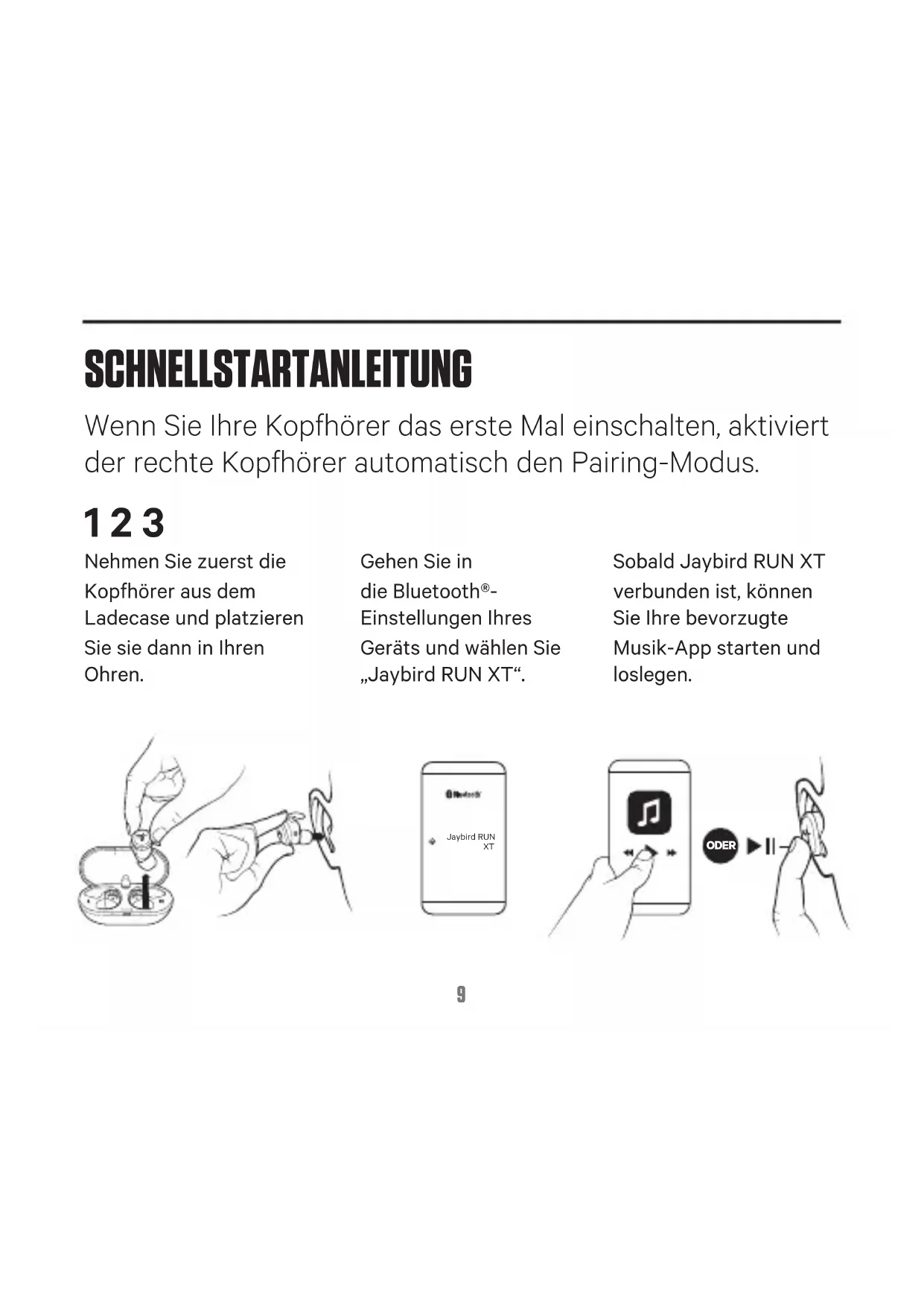 Nehmen Sie zuerst die Kopfhörer aus dem Ladecase und platzieren Sie sie dann in Ihren Ohren. Gehen Sie in die Bluetooth®- Einstellungen Ihres Geräts und wählen Sie „JaybirdRUN XT“. Sobald JaybirdRUN XT verbunden ist, können Sie Ihre bevorzugte Musik-App starten und loslegen. Wenn Sie Ihre Kopfhörer das erste Mal einschalten, aktiviert der rechte Kopfhörer automatisch den Pairing-Modus. SCHNELLSTARTANLEITUNG Jaybird RUN