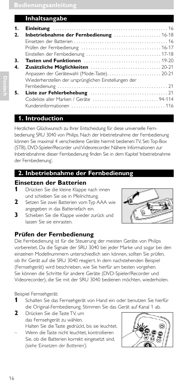 und schieben Sie sie in Pfeilrichtung. Setzen Sie zwei Batterien vom Typ AAA wie angegeben in das Batteriefach ein. Schieben Sie die Klappe wieder zurück und lassen Sie sie einrasten. Prüfen der Fernbedienung Die Fernbedienung ist für die Steuerung der meisten Geräte von Philips vorbereitet. Da die Signale der SRU 3040 bei jeder Marke und sogar bei den einzelnen Modellnummern unterschiedlich sein können, sollten Sie prüfen, ob Ihr Gerät auf die SRU 3040 reagiert. In dem nachstehenden Beispiel (Fernsehgerät) wird beschrieben, wie Sie hierfür am besten vorgehen. Sie können die Schritte für andere Geräte (DVD-Spieler/Recorder und Videorecorder), die Sie mit der SRU 3040 bedienen möchten, wiederholen. Beispiel Fernsehgerät: 1 Schalten Sie das Fernsehgerät von Hand ein oder benutzen Sie hierfür die Original-Fernbedienung. Stimmen Sie das Gerät auf Kanal 1 ab. 2 Drücken Sie die Taste TV, um das Fernsehgerät zu wählen. Halten Sie die Taste gedrückt, bis sie leuchtet. Wenn die Taste nicht leuchtet, kontrollieren Sie, ob die Batterien korrekt eingesetzt sind. (siehe ‘Einsetzen der Batterien’).