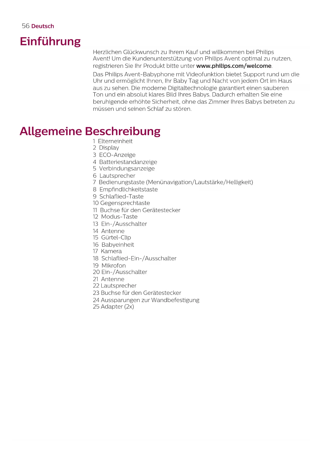 Herzlichen Glückwunsch zu Ihr dem Kauf und willkommen bei Philips Avent! Um die Kundenunterstützung von Philips Avent optimal zu nutzen, registrieren Sie Ihr Produktibe unter www.philips.com/welcome. Das Philips Avent-Babyphone mit Videofunktion bietet Support rund um die Uhr und ermöglich Ihnen, Ihr Baby Tag und Nacht von jedem Ort im Haus aus zu sehen. Die moderne Digitaltechnologie garantiert einen sauberen Ton und ein absolut klares Bild Ihres Babys. Dadurch erhalten Sie eine beruhigende erhöhte Sicherheit, ohne das Zimmer Ihres Babys betreten zu müssen und seinen Schlaf zu stären.
