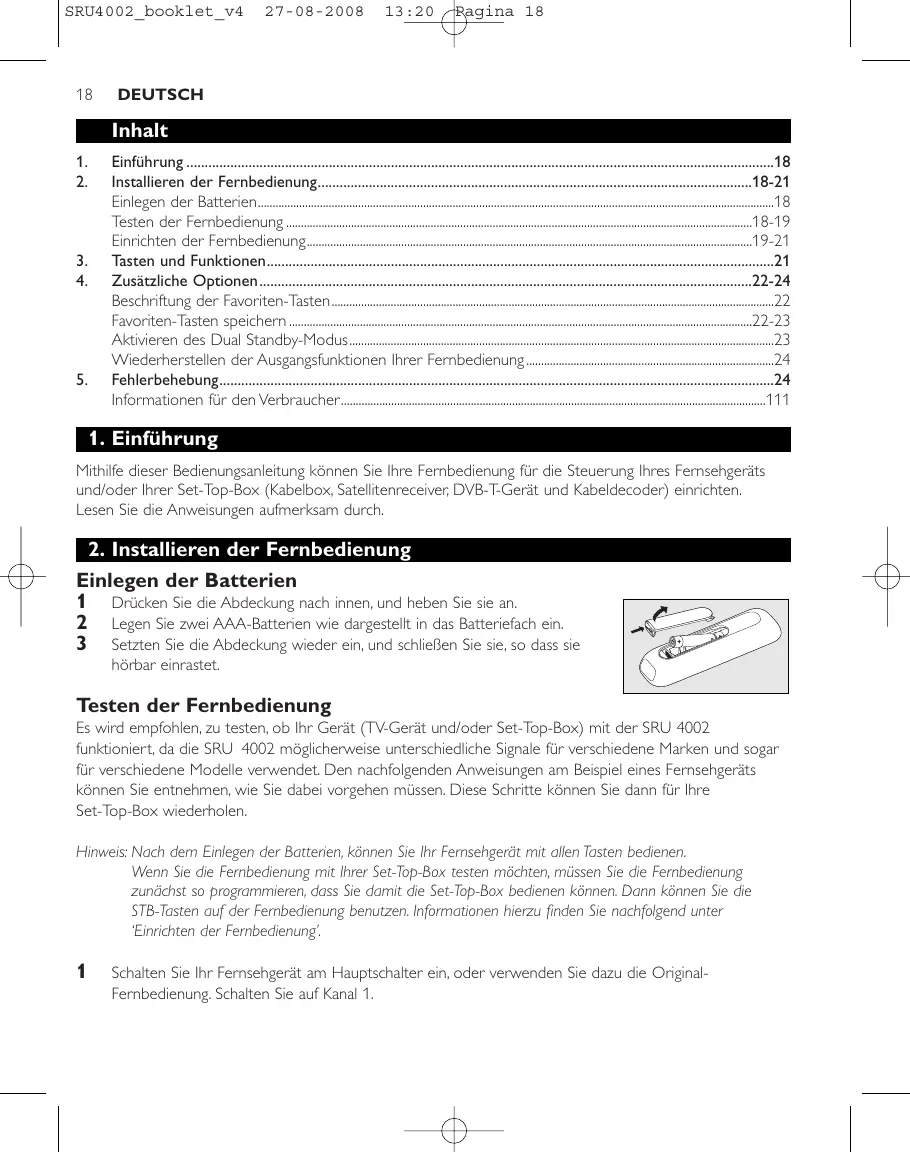 Einlegen der Batterien 1 Drücken Sie die Abdeckung nach innen, und heben Sie sie an. 2 Legen Sie zwei AAA-Batterien wie dargestellt in das Batteriefach ein. 3 Setzten Sie die Abdeckung wieder ein, und schließen Sie sie, so dass sie hörbar einrastet. Testen der Fernbedienung Es wird empfohlen, zu testen, ob Ihr Gerät (TV-Gerät und/oder Set-Top-Box) mit der SRU 4002 funktioniert, da die SRU 4002 möglicherweise unterschiedliche Signale für verschiedene Marken und sogar für verschiedene Modelle verwendet. Den nachfolgenden Anweisungen am Beispiel eines Fernsehgeräts können Sie entnehmen, wie Sie dabei vorgehen müssen. Diese Schritte können Sie dann für Ihre Set-Top-Box wiederholen. Hinweis: Nach dem Einlegen der Batterien, können Sie Ihr Fernsehgerät mit allen Tasten bedienen. Wenn Sie die Fernbedienung mit Ihrer Set-Top-Box testen möchten, müssen Sie die Fernbedienung zunächst so programmieren, dass Sie damit die Set-Top-Box bedienen können. Dann können Sie die STB-Tasten auf der Fernbedienung benutzen. Informationen hierzu finden Sie nachfolgend unter ‘Einrichten der Fernbedienung’.