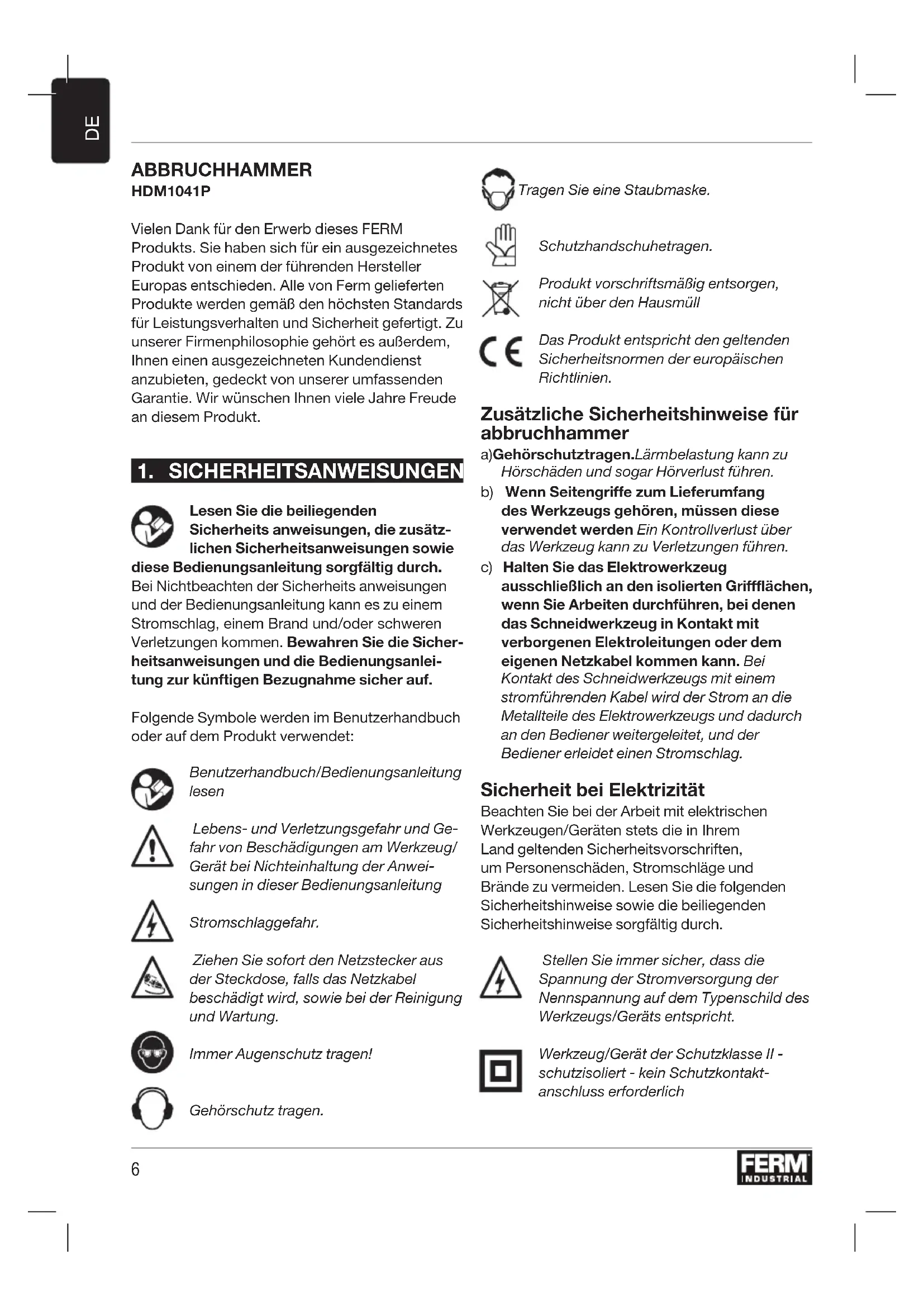 ABBRUCHHAMMER HDM1041P Vielen Dank für den Erwerb dieses FERM Produkts. Sie haben sich für ein ausgezeichnetes Produkt von einem der führenden Hersteller Europas entschieden. Alle von Ferm gelieferten Produkte werden gemäß den höchsten Standards für Leistungsverhalten und Sicherheit gefertigt. Zu unserer Firmenphilosophie gehört es außerdem, Ihnen einen ausgezeichneten Kundendienst anzubieten, gedeckt von unserer umfassenden Garantie. Wir wünschen Ihnen viele Jahre Freude an diesem Produkt.