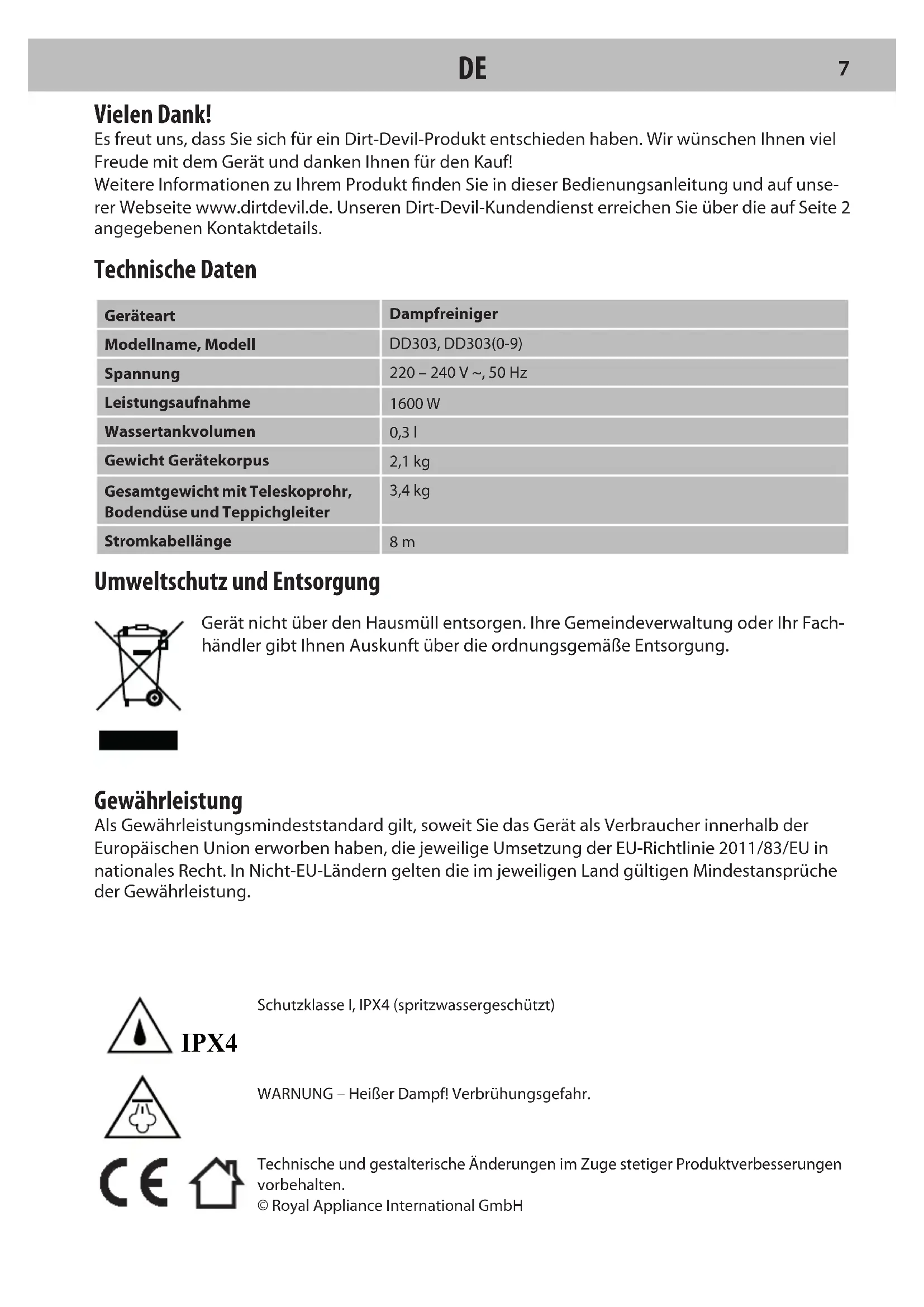 6IPX4 Umweltschutz und Entsorgung Gerät nicht über den Hausmüll entsorgen. Ihre Gemeindeverwaltung oder Ihr Fach- händler gibt Ihnen Auskunft über die ordnungsgemäße Entsorgung. Gewährleistung Als Gewährleistungsmindeststandard gilt, soweit Sie das Gerät als Verbraucher innerhalb der Europäischen Union erworben haben, die jeweilige Umsetzung der EU-Richtlinie 2011/83/EU in nationales Recht. In Nicht-EU-Ländern gelten die im jeweiligen Land gültigen Mindestansprüche der Gewährleistung. Technische und gestalterische Änderungen im Zuge stetiger Produktverbesserungenvorbehalten.© Royal Appliance International GmbH Vielen Dank! Es freut uns, dass Sie sich für ein Dirt-Devil-Produkt entschieden haben. Wir wünschen Ihnen viel Freude mit dem Gerät und danken Ihnen für den Kauf! Weitere Informationen zu Ihrem Produkt nden Sie in dieser Bedienungsanleitung und auf unse- rer Webseite www.dirtdevil.de. Unseren Dirt-Devil-Kundendienst erreichen Sie über die auf Seite 2 angegebenen Kontaktdetails. Technische Daten GeräteartDampfreinigerModellname, ModellDD303, DD303(0-9)Spannung220 – 240 V ~, 50 HzLeistungsaufnahme1600 WWassertankvolumen0,3 lGewicht Gerätekorpus2,1 kgGesamtgewicht mit Teleskoprohr, Bodendüse und Teppichgleiter3,4 kgStromkabellänge 8 m WARNUNG – Heißer Dampf! Verbrühungsgefahr.Schutzklasse I, IPX4 (spritzwassergeschützt)