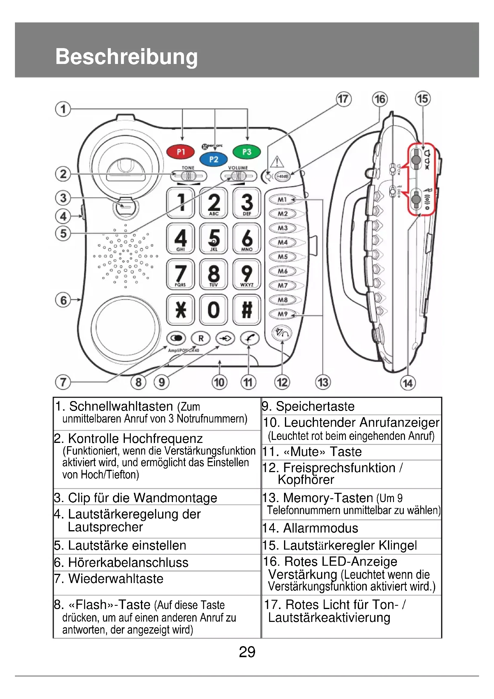 Drücken Sie auf die Taste +50dB )37 10 – Einen Anruf tätigen Über den Hörer : Den Hörer abnehmen. Auf das Freizeichen warten, die gewünschte Nummer wählen. Am Ende des Telefonats den Hörer wieder auflegen. Über den Kopfhörer (option) : Auf die Taste drücken, auf das Freizeichen warten. Die Nummer wählen. Die Taste erneut drücken, um den Anruf zu beenden. Mit der Freisprechfunktion Am Ende des Telefonats einfach auf die Taste drücken, um das Gespräch zu beenden. Um die Freisprecheinrichtung während eines Telefonats auszuschalten,heben Sie den Hörer ab.Um die Freisprecheinrichtung während eines Telefonats einzuschalten,drücken Sie auf den Knopf, dann legen Sie den Hörer auf die Basisstation.Während eines Gespräches können Sie die Lautstärke der Freisprechfunktion auf die gewünschte Höhe einstellen, benutzen Sie einfach der Regler auf den linken Seite des Geräts. 11 – Wahlwiederholung - Heben Sie den Hörer ab. - Warten Sie auf das Freizeichen und drücken Sie den Knopf. - Die zuletzt gewählte Telefonnummer wird automatisch noch einmal gewählt (gilt nicht für Direktwahltasten). 12 – R-Taste, * und # - Tasten Diese Tasten werden für verschiedene Dienste Ihres Serviceproviders verwendet. Bitte kontaktieren Sie diesen für weitere Informationen. 13 – Stummtaste Wenn Sie mit jemandem im Raum sprechen wollen, ohne dass Ihr Gesprächspartner mithören kann, drücken Sie die Taste. Sie können Ihren Gesprächspartner weiterhin hören, dieser kann Sie jedoch nicht hören. Um das Gespräch wieder normal weiterzuführen, drücken Sie die Taste wieder. Benutzung des telefons38 14 – Speichern von Telefonnummern Ihr Gerät AmpliPOWER40/50 kann 9 (M1-M9) + 3 (rote, blaue und grüne Tasten) Telefonnummern speichern. Zum Beispiel können die drei Farbtasten als Notrufbenutzt werden (z.B.: Polizei, Feuerwehr, Krankenwagen). NG DES. Um eine Nummer zu speichern, gehen Sie wie folgt vor: - Den Hörer abheben. - Die Taste drücken. - Auf die Direktwahltaste (M1 - M9) oder auf eine der Farbtasten drücken. - Die Nummer, die gespeichert werden soll, eingeben. - Die Taste erneut drücken. Falls der Telefonstecker einige Stunden aus der Steckdose herausgezogen wird, gehen die gespeicherten Telefonnummern verloren. Wenn man wie oben beschrieben vorgeht und auf eine Taste drückt, auf der bereits eine Telefonnummer gespeichert worden ist, wird die vorher gespeicherte Nummer gelöscht. 15 – Anruf mit gespeicherter Nummer tätigen - Heben Sie den Telefonhörer ab und warten Sie auf das Freizeichen. - Drücken Sie M1 bis M9 oder eine der Notfalltasten; die gespeicherte Nummer wird automatisch angewählt. Um die gespeicherten Telefonnummern registrieren, verwenden Sie den Index unter der Basis entfernt.