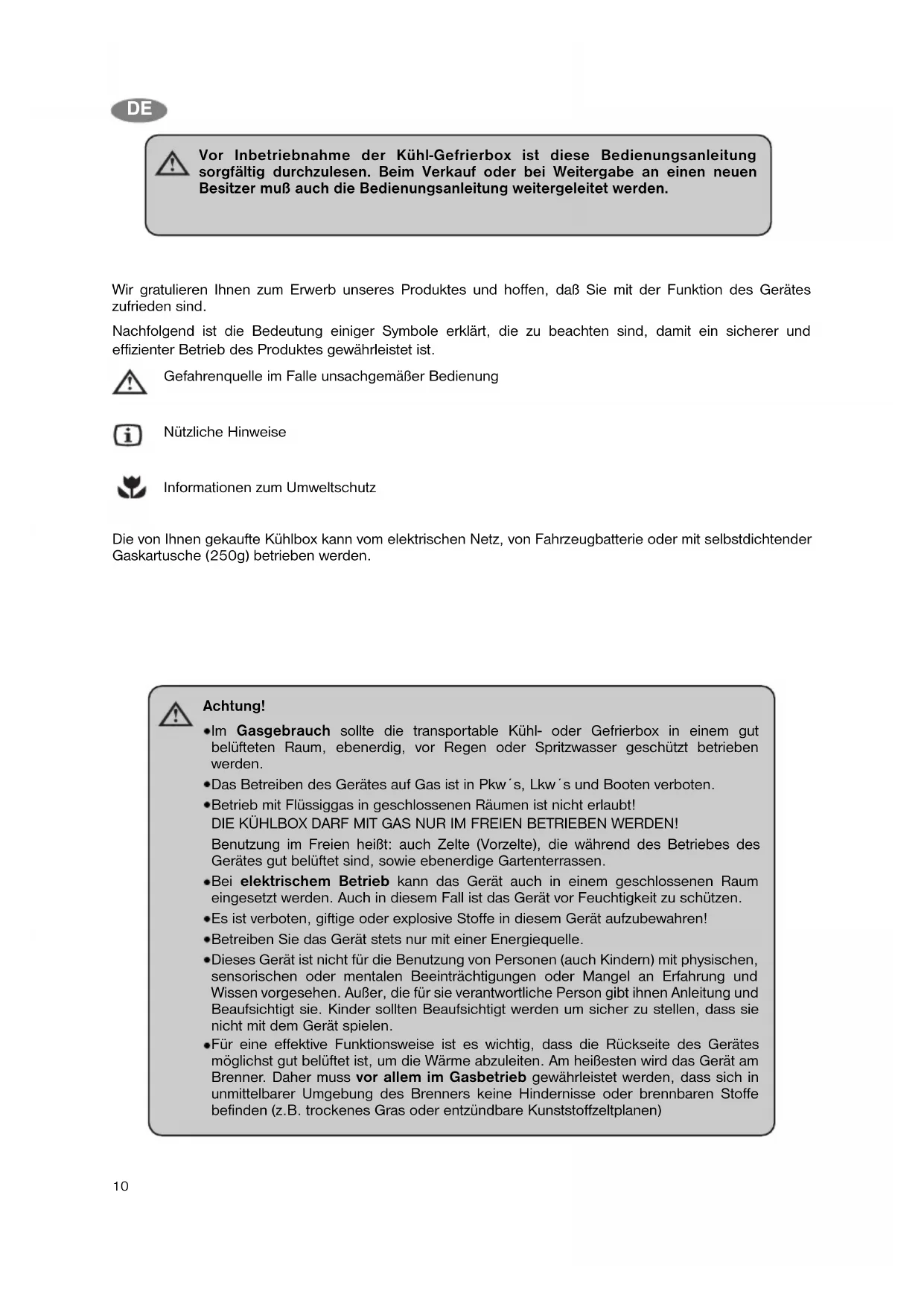 Wir gratulieren Ihnen zum Erwerb unseres Produktes und hoffen, daß Sie mit der Funktion des Gerätes zufrieden sind. Nachfolgend ist die Bedeutung einiger Symbole erklärt, die zu beachten sind, damit ein sicherer und effizienter Betrieb des Produktes gewährleistet ist. Gefahrenquelle im Falle unsachgemäßer Bedienung Nützliche Hinweise Informationen zum Umweltschutz Die von Ihnen gekaufte Kühlbox kann vom elektrischen Netz, von Fahrzeugbatterie oder mit selbstdichtender Gaskartusche (250g) betrieben werden. Achtung! Im Gasgebrauch sollte die transportable Kühl- oder Gefrierbox in einem gut belüfteten Raum, ebenerdig, vor Regen oder Spritzwasser geschützt betrieben werden. Das Betreiben des Gerätes auf Gas ist in Pkw´s, Lkw´s und Booten verboten. Betrieb mit Flüssiggas in geschlossenen Räumen ist nicht erlaubt! DIE KÜHLBOX DARF MIT GAS NUR IM FREIEN BETRIEBEN WERDEN! Benutzung im Freien heißt: auch Zelte (Vorzelte), die während des Betriebes des Gerätes gut belüftet sind, sowie ebenerdige Gartenterrassen. Bei elektrischem Betrieb kann das Gerät auch in einem geschlossenen Raum eingesetzt werden. Auch in diesem Fall ist das Gerät vor Feuchtigkeit zu schützen. Es ist verboten, giftige oder explosive Stoffe in diesem Gerät aufzubewahren! Betreiben Sie das Gerät stets nur mit einer Energiequelle. Dieses Gerät ist nicht für die Benutzung von Personen (auch Kindern) mit physischen, sensorischen oder mentalen Beeinträchtigungen oder Mangel an Erfahrung und Wissen vorgesehen. Außer, die für sie verantwortliche Person gibt ihnen Anleitung und Beaufsichtigt sie. Kinder sollten Beaufsichtigt werden um sicher zu stellen, dass sie nicht mit dem Gerät spielen. Für eine effektive Funktionsweise ist es wichtig, dass die Rückseite des Gerätes möglichst gut belüftet ist, um die Wärme abzuleiten. Am heißesten wird das Gerät am Brenner. Daher muss vor allem im Gasbetrieb gewährleistet werden, dass sich in unmittelbarer Umgebung des Brenners keine Hindernisse oder brennbaren Stoffe befinden (z.B. trockenes Gras oder entzündbare Kunststoffzeltplanen) Vor Inbetriebnahme der Kühl-Gefrierbox ist diese Bedienungsanleitung sorgfältig durchzulesen. Beim Verkauf oder bei Weitergabe an einen neuen Besitzer muß auch die Bedienungsanleitung weitergeleitet werden.11