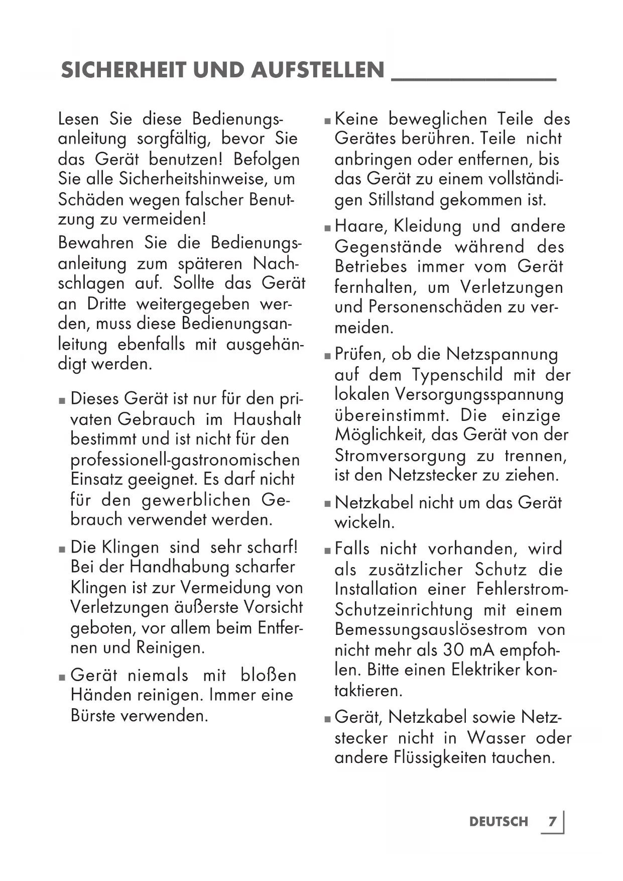 Knochen und Steine zur Ver- meidung von Schäden an Klingen und Gerät aus Lebens- mitteln entfernen.11 DEUTSC H BETRIEB __________________________________ Hinweise