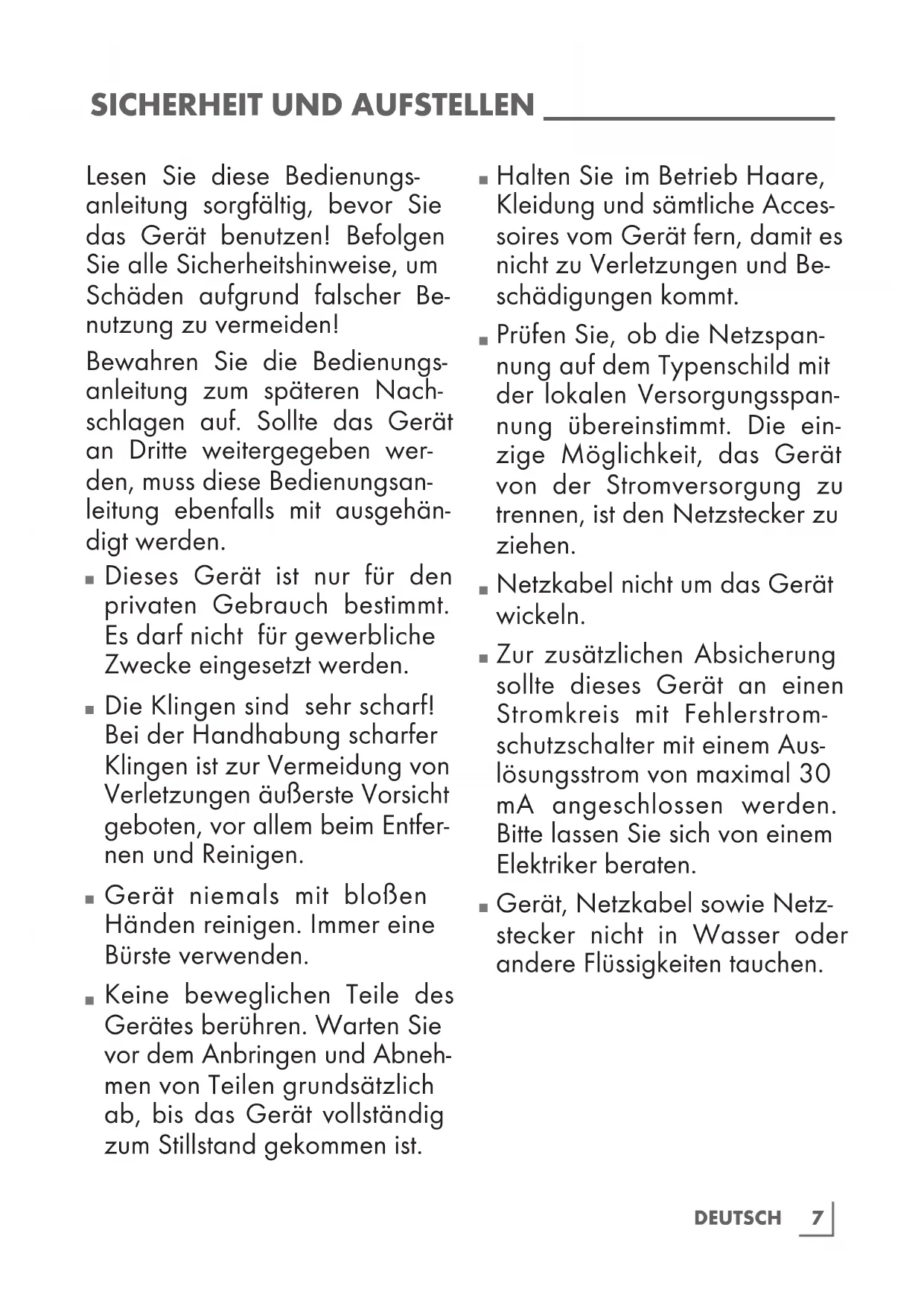 Gerät, Netzkabel sowie Netz- stecker nicht in Wasser oder andere Flüssigkeiten tauchen.8 DEUTSC H