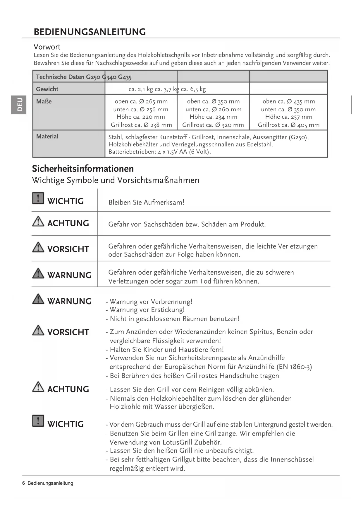 CRO Popis dijelovaTechnische Daten G250 G340 G435 Gewicht ca. 2,1 kg ca. 3,7 kg ca. 6,5 kg Maße oben ca. Ø 265 mm unten ca. Ø 256 mm Höhe ca. 220 mm Grillrost ca. Ø 238 mm oben ca. Ø 350 mm unten ca. Ø 260 mm Höhe ca. 234 mm Grillrost ca. Ø 320 mm oben ca. Ø 435 mm unten ca. Ø 350 mm Höhe ca. 257 mm Grillrost ca. Ø 405 mm Material Stahl, schlagfester Kunststoff · Grillrost, Innenschale, Aussengitter (G250), Holzkohlebehälter und Verriegelungsschnallen aus Edelstahl. Batteriebetrieben: 4 x 1.5V AA (6 Volt). BEDIENUNGSANLEITUNG 6 Bedienungsanleitung - Warnung vor Verbrennung! - Warnung vor Erstickung! - Nicht in geschlossenen Räumen benutzen! - Zum Anzünden oder Wiederanzünden keinen Spiritus, Benzin oder vergleichbare Flüssigkeit verwenden! - Halten Sie Kinder und Haustiere fern! - Verwenden Sie nur Sicherheitsbrennpaste als Anzündhilfe entsprechend der Europäischen Norm für Anzündhilfe (EN 1860-3) - Bei Berühren des heißen Grillrostes Handschuhe tragen - Lassen Sie den Grill vor dem Reinigen völlig abkühlen. - Niemals den Holzkohlebehälter zum löschen der glühenden Holzkohle mit Wasser übergießen. - Vor dem Gebrauch muss der Grill auf eine stabilen Untergrund gestellt werden. - Benutzen Sie beim Grillen eine Grillzange. Wir empfehlen die Verwendung von LotusGrill Zubehör. - Lassen Sie den heißen Grill nie unbeaufsichtigt. - Bei sehr fetthaltigen Grillgut bitte beachten, dass die Innenschüssel regelmäßig entleert wird. Bleiben Sie Aufmerksam! Gefahr von Sachschäden bzw. Schäden am Produkt. Gefahren oder gefährliche Verhaltensweisen, die zu schweren Verletzungen oder sogar zum Tod führen können. Gefahren oder gefährliche Verhaltensweisen, die leichte Verletzungen oder Sachschäden zur Folge haben können. Wichtige Symbole und Vorsichtsmaßnahmen Sicherheitsinformationen Vorwort Lesen Sie die Bedienungsanleitung des Holzkohletischgrills vor Inbetriebnahme vollständig und sorgfältig durch. Bewahren Sie diese für Nachschlagezwecke auf und geben diese auch an jeden nachfolgenden Verwender weiter. WARNUNG ACHTUNG VORSICHT WICHTIG WARNUNG VORSICHT ACHTUNG WICHTIG DEUDieser Holzkohletischgrill darf zum Grillen mit Holzkohle für die Zubereitung von grillbaren Speisen eingesetzt werden. Dieser Holzkohletischgrill darf nicht in geschlossenen Räumen verwendet werden. Alle Vorgaben dieser Bedienungsanteilung sind unverändert einzuhalten. Der Holzkohletischgrill ist nur für den privaten Gebrauch bestimmt! Bestimmungsgemäße Verwendung Lesen Sie die Montageanleitung sorgfältig durch und befolgen Sie die Sicherheitshinweise. Nehmen Sie sich ausreichend Zeit für den Zusammenbau. Schaffen Sie zuvor eine ebene Arbeitsfläche mit ausreichend Platz. Entnehmen Sie das Gerät der Verpackung! Allgemeine Hinweise zur Montage Batterien sicher handhaben und entsorgen Die sichere Handhabung der Batterien ist zu beachten: Es dürfen nur im Handel zugelassene AA-Batterien in einwandfreiem Zustand verwendet werden. Die ordnungsgemäße Entsorgung der Batterien ist zu beachten: Die leeren Batterien sind nach den gesetzlichen Bestimmungen des Batteriegesetzes (BattG) zu entsorgen, d.h. bei den von den Händlern eingerichteten Sammelstellen abzugeben. Die leeren Batterien dürfen nicht im Hausmüll entsorgt werden. Deutsch 7 Holzkohle sicher entsorgen Entsorgen Sie die verbrauchte Holzkohle nur in dafür vorgesehene Gefäße aus Metall oder ande- ren nicht brennbaren Materialien. Geben Sie diese nicht in Kunststoff- oder andere Behälter aus brennbaren Materialien. Altgerät umweltgerecht entsorgen Entsorgen Sie Ihr Altgerät getrennt vom Hausmüll durch Abgabe an den hierfür vorgesehenen Sammelstellen. Diese teilt Ihnen der Her- steller auf Anfrage mit. Sicherheitsinformationen DEUFür den Kauf eines LotusGrills stehen Ihnen die gesetzlichen Gewährleistungsrechte zu. Die Rückseite dieser Bedienungsanleitung mit Händlerstempel bzw. Ihre Kaufquittung mit Angaben des Kaufdatums ist Ihr Gewährleistungsnachweis. Eventueller Verschleiß, Rostbildung, Verformung und Verfärbung der Teile (insbesondere der Edelstahlteile), die direkt dem Feuer ausgesetzt sind, sind normal und funktionsbedingt und stellen keinen Gewährleistungsfall dar. Der Holzkohlebehälter ist ein Verschleißteil und sollte von Zeit zu Zeit gewechselt werden. Gewährleistung: Sie müssen den Grill vor der Reinigung vollständig abkühlen lassen. Benutzen Sie kein Wasser, um den heißen Grill abzukühlen. Es kann sonst zu Verbrennungen und Verbrühungen kommen. - Nach jeder Benutzung sind der Grillrost und die Innenschüssel sowie sonstige verschmutze Teile zu reinigen. - Warten Sie mit der Reinigung unbedingt bis der Grill vollständig abgekühlt ist, da sonst die Gefahr von Verbrennungen besteht. - Grillrost und Innenschüssel können entweder in der Spülmaschine oder per Hand mit allen handelsüblichen Geschirrspülmitteln gereinigt werden. - Wir empfehlen zur Reinigung hartnäckiger Rückstände, handelsübliche Grillreiniger z. B. den LotusGrill Grill- und Backofenreiniger. Verwenden Sie zur Reinigung niemals Säure, Lösungsbenzin oder andere brennbaren Stoffe. - Die Außenschale mit der Elektroeinheit mit einem feuchten Lappen oder einer Bürste reinigen. - Vor längerer Außerbetriebsetzung sollten die Batterien aus dem Gerät entfernt werden. - Der Holzkohlebehälter darf nur trocken, z. B. mit einer Bürste, gereinigt werden. Pege und Aufbewahrung Überprüfen Sie bitte anhand der nachstehenden Einzelteilliste und der Zeichnung die Voll- ständigkeit des Lieferumfangs: Nehmen Sie den vormontierten Grillrost ab und den Holzkohlebehälter heraus. Entfernen Sie das Verpackungsmaterial. Montagevorbereitung Auf dem Holzkohlebehälter können produktionsbedingt Ölreste sein, die nur bei der ersten Benutzung leichte Rauchentwicklung verusachen können. Erste Benutzung 8 Bedienungsanleitung WICHTIG VORSICHT ACHTUNG Den Holzkohlebehälter nie mit Wasser reinigen! DEUMontagebeschreibung