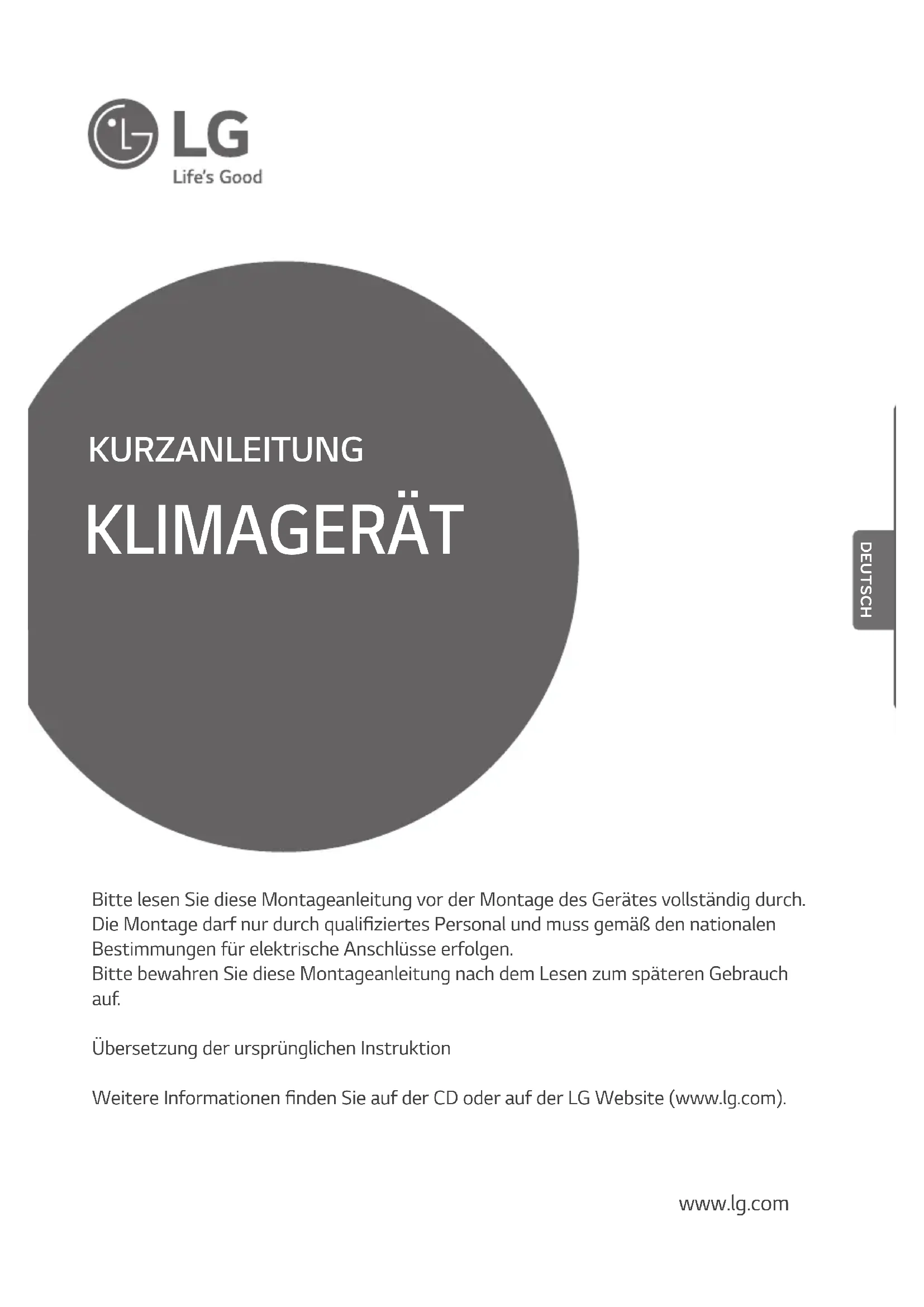 - Ce produit dispose d'un circuit de protection contre les surtensions. Une erreur peut se produire, mais cela n'a rien d'anormal. Après quelques minutes, le fonctionnement redeviendra normal.10 FRANÇAISKURZANLEITUNG KLIMAGERÄT www.lg.com Bitte lesen Sie diese Montageanleitung vor der Montage des Gerätes vollständig durch. Die Montage darf nur durch qualifiziertes Personal und muss gemäß den nationalen Bestimmungen für elektrische Anschlüsse erfolgen. Bitte bewahren Sie diese Montageanleitung nach dem Lesen zum späteren Gebrauch auf. Übersetzung der ursprünglichen Instruktion Weitere Informationen finden Sie auf der CD oder auf der LG Website (www.lg.com). DEUTSCH2 MODELLBEZEICHNUNG DEUTSCH MODELLBEZEICHNUNG - Produktbezeichnung: Klimagerät - Modellname: - Zusatzinformationen: Die Seriennummer befindet sich auf dem Strichcode am Gerät. - Maximal zulässiger Druck an der hohen Seite: 4,2 Mpa/Niedrige Seite: 2,4 Mpa - Kältemittel: R410A Geräteinformationen Der von diesem Gerät A-bewertete Schalldruckpegel beträgt weniger als 70 dB. ** Der Geräuschpegel kann je nach Standort variieren. Bei den angegebenen Emissionswerten handelt es sich nicht in jedem Fall um sichere Arbeitswerte. Obwohl eine Wechselwirkung zwischen Emissions- und Belastungswerten existiert, kann mithilfe dieser Werte jedoch nicht zuverlässig bestimmt werden, ob weitere Vorsichtsmaßnahmen erforderlich sind. Zu den Einflussfaktoren der tatsächlichen Belastung gehören die Eigenschaften des Arbeitsraumes sowie sonstige Geräuschquellen, z. B. die Anzahl der Geräte und andere Vorgänge in der Nähe sowie die Dauer, die ein Bediener den Geräuschen ausgesetzt ist. Die zulässigen Belastungswerte können je nach Land variieren. Mithilfe dieser Angaben kann ein Bediener jedoch die Gefahren und Belastungsrisiken besser einschätzen. Die Grenzkonzentration gibt die Konzentration des Kältemittelgases an, bis zu dessen Erreichen im Falle eines Kältemittellecks keine Gesundheitsschäden hervorgerufen werden. Die Grenzkonzentration sollte bei allen Berechnungen in der Einheit kg/m³ angegeben werden (Gewicht des Kältemittelgases pro Lufteinheit). Geräuschemission Grenzkonzentration n Berechnung der Kältemittelkonzentration Gesamtmenge der Kältemittelbefüllung im Kältemittelsystem (kg) Größe des kleinsten Raumes, in dem ein Innengerät montiert wurde (m³) Kältemittelkon zentration (kg/m³)