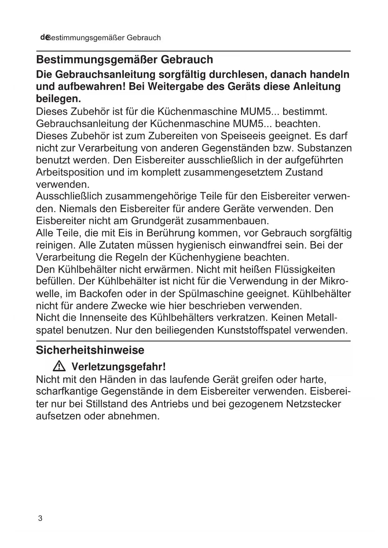 Bestimmungsgemäßer Gebrauch Bestimmungsgemäßer Gebrauch Die Gebrauchsanleitung sorgfältig durchlesen, danach handeln und aufbewahren! Bei Weitergabe des Geräts diese Anleitung beilegen. Dieses Zubehör ist für die Küchenmaschine MUM5... bestimmt. Gebrauchsanleitung der Küchenmaschine MUM5... beachten. Dieses Zubehör ist zum Zubereiten von Speiseeis geeignet. Es darf nicht zur Verarbeitung von anderen Gegenständen bzw. Substanzen benutzt werden. Den Eisbereiter ausschließlich in der aufgeführten Arbeitsposition und im komplett zusammengesetztem Zustand verwenden. Ausschließlich zusammengehörige Teile für den Eisbereiter verwen- den. Niemals den Eisbereiter für andere Geräte verwenden. Den Eisbereiter nicht am Grundgerät zusammenbauen. Alle Teile, die mit Eis in Berührung kommen, vor Gebrauch sorgfältig reinigen. Alle Zutaten müssen hygienisch einwandfrei sein. Bei der Verarbeitung die Regeln der Küchenhygiene beachten. Den Kühlbehälter nicht erwärmen. Nicht mit heißen Flüssigkeiten befüllen. Der Kühlbehälter ist nicht für die Verwendung in der Mikro- welle, im Backofen oder in der Spülmaschine geeignet. Kühlbehälter nicht für andere Zwecke wie hier beschrieben verwenden. Nicht die Innenseite des Kühlbehälters verkratzen. Keinen Metall- spatel benutzen. Nur den beiliegenden Kunststoffspatel verwenden. Sicherheitshinweise W Verletzungsgefahr! Nicht mit den Händen in das laufende Gerät greifen oder harte, scharfkantige Gegenstände in dem Eisbereiter verwenden. Eisberei- ter nur bei Stillstand des Antriebs und bei gezogenem Netzstecker aufsetzen oder abnehmen.4 de Auf einen Blick Auf einen Blick Bitte Bildseiten ausklappen. X Bild A 1 Gerätedeckel a Markierungen 2 Rührarm mit Kupplung a Mitnehmer-Stifte 3 Kühlbehälter 4 Halterung für Kühlbehälter 5 Kunststoffspatel Überlastsicherung Um bei einer Überlastung des Eisbereiters größere Schäden an Ihrem Gerät zu verhin- dern, verfügt der Rührarm über eine Kupp- lung. Sollte sich während des Betriebes der Rührarm festsetzen, ist ein knackendes Geräusch hörbar. Das Gerät sofort abschalten! Prüfen, ob die in den Rezepten ange- gebenen Mengen nicht überschritten wurden. Gegebenenfalls einen Teil der Rohmasse entfernen und das Gerät wieder einschalten. Hinweis: Ein knackendes Geräusch des Rührarmes vor Ablauf der angegebenen Verarbeitungszeit zeigt die vorzeitige Fertig- stellung des Eises an. Vor dem ersten Gebrauch Bevor das Zubehör benutzt werden kann, muss dieses vollständig entpackt, gereinigt und geprüft werden. Achtung! Ein beschädigtes Zubehör nie in Betrieb nehmen! ■ Alle Zubehörteile aus der Verpackung nehmen. ■ Vorhandenes Verpackungsmaterial entfernen. ■ Zusammengebaute Teile in die Einzel- teile zerlegen. Dabei in umgekehrter Reihenfolge vorgehen, wie unter „Vorbe- reitung“ beschrieben. ■ Alle Teile auf Vollständigkeit prüfen. X Bild A ■ Alle Teile auf sichtbare Schäden überprüfen. ■ Vor dem ersten Gebrauch alle Teile gründlich reinigen und trocknen. X„PegeundtäglicheReinigung“ sieheSeite5 Vorbereitung Eisbereiter kühlen Achtung! Für die Speiseeis-Zubereitung muss der Kühlbehälter einwandfrei gereinigt sein. X Bildfolge B