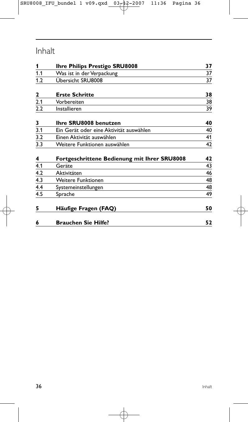 Inhalt SRU8008_IFU_bundel 1 v09.qxd 03-12-2007 11:36 Pagina 37 Herzlich Willkommen in der stetig wachsenden Familie der Besitzer von Philips-Produkten. Mit der Philips Prestigo SRU8008 UniversalFernbedienung können Sie Ihre Geräte bequem bedienen. Sie können bis zu 8 Geräte und bis zu 8 Aktivitäten installieren. Wählen Sie ein Gerät aus und bedienen Sie es mit den Tasten der SRU8008. Mit der Auswahl einer Aktivität starten Sie automatisch eine Folge von Tastenbefehlen, um z. B. eine DVD anzuschauen oder Musik von einer CD zu hören. Wählen Sie weitere Funktionen, und weisen Sie Ihrer Fernbedienung erweiterte Funktionen zu.